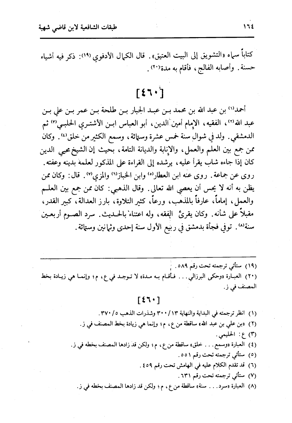 460 - أَحْمد بن عبد الله بن مُحَمَّد بن عبد الْجَبَّار بن طَلْحَة بن عمر بن عَليّ بن عبد الله الْفَقِيه الإِمَام أَمِين الدَّين أَبُو الْعَبَّاس ابْن الأشتري الْحلَبِي ثمَّ الدِّمَشْقِي ولد فِي شَوَّال سنة خمس عشرَة وسِتمِائَة وَسمع الْكثير من خلق وَكَانَ مِمَّن جمع بَين الْعلم وَالْعَمَل والإنابة والديانة التَّامَّة بِحَيْثُ إِن الشَّيْخ مُحي الدَّين كَانَ إِذا جَاءَهُ شَاب يقْرَأ عَلَيْهِ يرشده إِلَى الْقِرَاءَة على الْمَذْكُور لعلمه بِدِينِهِ وعفته روى عَن جمَاعَة روى عَنهُ ابْن الْعَطَّار وَابْن الخباز والمزي قَالَ وَكَانَ مِمَّن يظنّ بِهِ أَنه لَا يحس ان يَعْصِي الله تَعَالَى وَقَالَ الذَّهَبِيّ كَانَ مِمَّن جمع بَين الْعلم وَالْعَمَل إِمَامًا عَارِفًا بِالْمذهبِ ورعا كثير التِّلَاوَة بارز الْعَدَالَة كَبِير الْقدر مُقبلا على شَأْنه وَكَانَ يقرئ الْفِقْه وَله اعتناء بِالْحَدِيثِ سرد الصَّوْم أَرْبَعِينَ سنة توفّي فَجْأَة بِدِمَشْق فِي ربيع الأول سنة إِحْدَى وَثَمَانِينَ وسِتمِائَة
