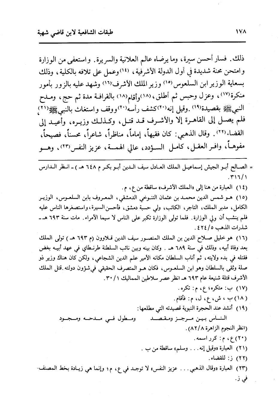 ذَلِك فَسَار أحسن سيرة وَمَا يرضاه عَالم الْعَلَانِيَة والسريرة واستعفى من الوزارة وامتحن محنة شَدِيدَة فِي أول الدولة الأشرفية وَعمل على تلافه بِالْكُلِّيَّةِ وَذَلِكَ بسعاية الْوَزير ابْن السلعوس وَزِير الْملك الْأَشْرَف وَشهد عَلَيْهِ بالزور بِأُمُور مُنكرَة وعزل وَحبس ثمَّ أطلق وَأقَام بالقرافة مُدَّة ثمَّ حج ومدح النَّبِي صلى الله عَلَيْهِ وَسلم بقصيدة وَقيل إِنَّه كشف رَأسه ووقف واستغاث بِالنَّبِيِّ صلى الله عَلَيْهِ وَسلم فَلم يصل إِلَى الْقَاهِرَة إِلَّا والأشرف قد قتل وَكَذَلِكَ وزيره وأعيد إِلَى الْقَضَاء وَقَالَ الذَّهَبِيّ كَانَ فَقِيها إِمَامًا مناظرا شَاعِرًا محسنا فصيحا مفوها وافر الْعقل كَامِل السؤدد عالي الهمة عَزِيز النَّفس وَهُوَ