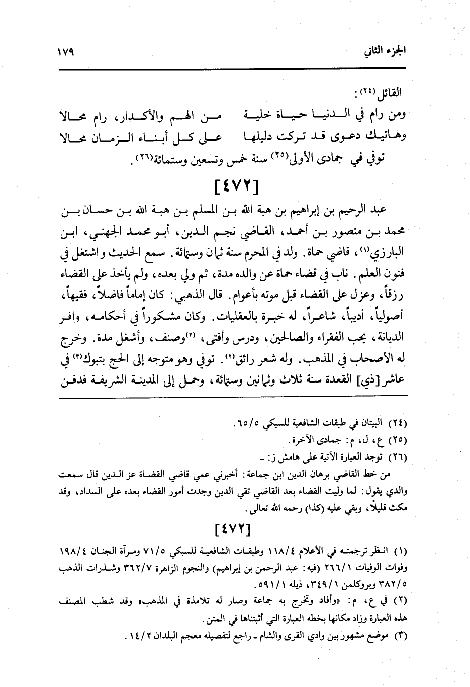 472 - عبد الرَّحِيم بن ابراهيم بن هبة الله بن الْمُسلم بن هبة الله بن حسان بن مُحَمَّد بن مَنْصُور بن أَحْمد القَاضِي نجم الدَّين أَبُو مُحَمَّد الْجُهَنِيّ ابْن الْبَارِزِيّ قَاضِي حماة ولد فِي الْمحرم سنة ثَمَان وسِتمِائَة سمع الحَدِيث واشتغل فِي فنون الْعلم نَاب فِي قَضَاء حماة عَن وَالِده مُدَّة ثمَّ ولي بعده وَلم يَأْخُذ على الْقَضَاء رزقا وعزل على الْقَضَاء قبل مَوته بأعوام قَالَ الذَّهَبِيّ كَانَ إِمَامًا فَاضلا فَقِيها اصوليا أديبا شَاعِرًا لَهُ خبْرَة بالعقليات وَكَانَ مشكورا فِي أَحْكَامه وافر الدّيانَة يحب الْفُقَرَاء وَالصَّالِحِينَ ودرس وَأفْتى وصنف وأشغل مُدَّة وَخرج لَهُ الْأَصْحَاب فِي الْمَذْهَب وَله شعر رائق توفّي وَهُوَ مُتَوَجّه الى الْحَج بتبوك فِي عَاشر ذِي الْقعدَة سنة ثَلَاث وَثَمَانِينَ وسِتمِائَة وَحمل إِلَى الْمَدِينَة الشَّرِيفَة فَدفن