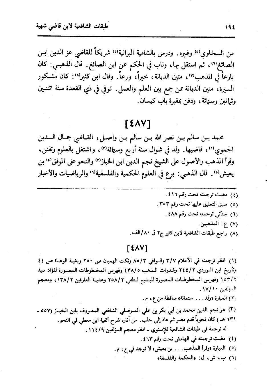 487 - مُحَمَّد بن سَالم بن نصر الله بن سَالم بن وَاصل القَاضِي جمال الدَّين الْحَمَوِيّ قاضيها ولد فِي شَوَّال سنة أَربع وسِتمِائَة واشتغل بالعلوم وتفنن وَقَرَأَ الْمَذْهَب وَالْأُصُول على الشَّيْخ نجم الدَّين ابْن الخباز والنحو على الْمُوفق بن يعِيش قَالَ الذَّهَبِيّ برع فِي الْعُلُوم الْحكمِيَّة والفلسفية والرياضيات وَالْأَخْبَار