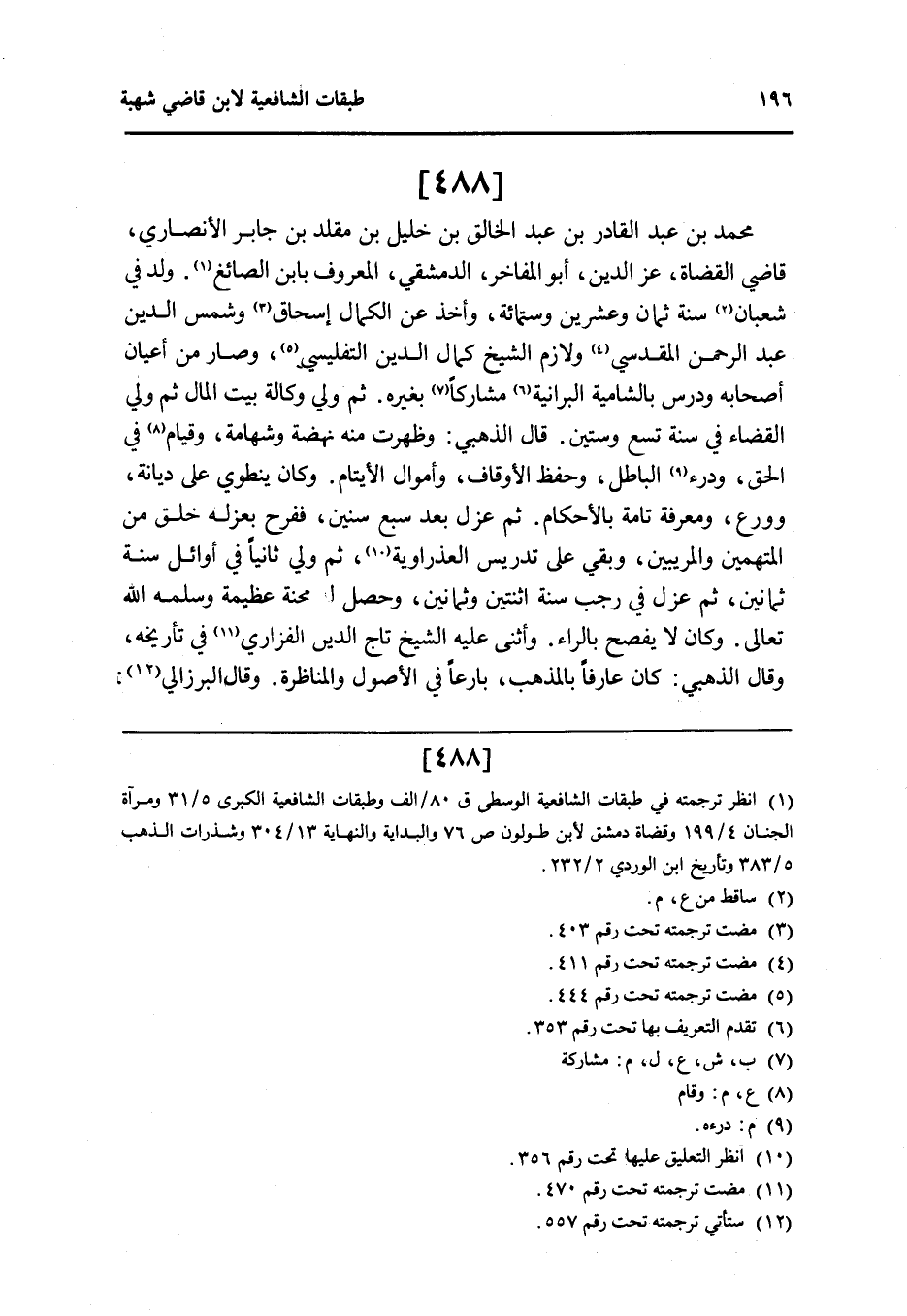 488 - مُحَمَّد بن عبد الْقَادِر بن عبد الْخَالِق بن خَلِيل بن مقلد بن جَابر الْأنْصَارِيّ قَاضِي الْقُضَاة عز الدَّين أَبُو المفاخر الدِّمَشْقِي الْمَعْرُوف بِابْن الصَّائِغ ولد فِي شعْبَان سنة ثَمَان وَعشْرين وسِتمِائَة وَأخذ عَن الْكَمَال إِسْحَاق وشمس الدَّين عبد الرَّحْمَن الْمَقْدِسِي ولازم الشَّيْخ كَمَال الدَّين التفليسي وَصَارَ من أَعْيَان أَصْحَابه ودرس بالشامية البرانية مشاركا بِغَيْرِهِ ثمَّ ولي وكَالَة بَيت المَال ثمَّ ولي الْقَضَاء فِي سنة تسع وَسِتِّينَ قَالَ الذَّهَبِيّ وَظَهَرت مِنْهُ نهضة وشهامة وَقيام فِي الْحق ودرء الْبَاطِل وَحفظ الْأَوْقَاف وأموال الْأَيْتَام وَكَانَ ينطوي على ديانَة وورع وَمَعْرِفَة تَامَّة بِالْأَحْكَامِ ثمَّ عزل بعد سبع سِنِين ففرح بعزله خلق من المتهمين والمريبين وَبَقِي على تدريس العذراوية ثمَّ ولي ثَانِيًا فِي أَوَائِل سنة ثَمَانِينَ ثمَّ عزل فِي رَجَب سنة اثْنَتَيْنِ وَثَمَانِينَ وَحصل لَهُ محنة عَظِيمَة وَسلمهُ الله تَعَالَى وَكَانَ لَا يفصح بالراء وَأثْنى عَلَيْهِ الشَّيْخ تَاج الدَّين الْفَزارِيّ فِي تأريخه وَقَالَ الذَّهَبِيّ كَانَ عَارِفًا بِالْمذهبِ بارعا فِي الْأُصُول والمناظرة وَقَالَ البرزالي