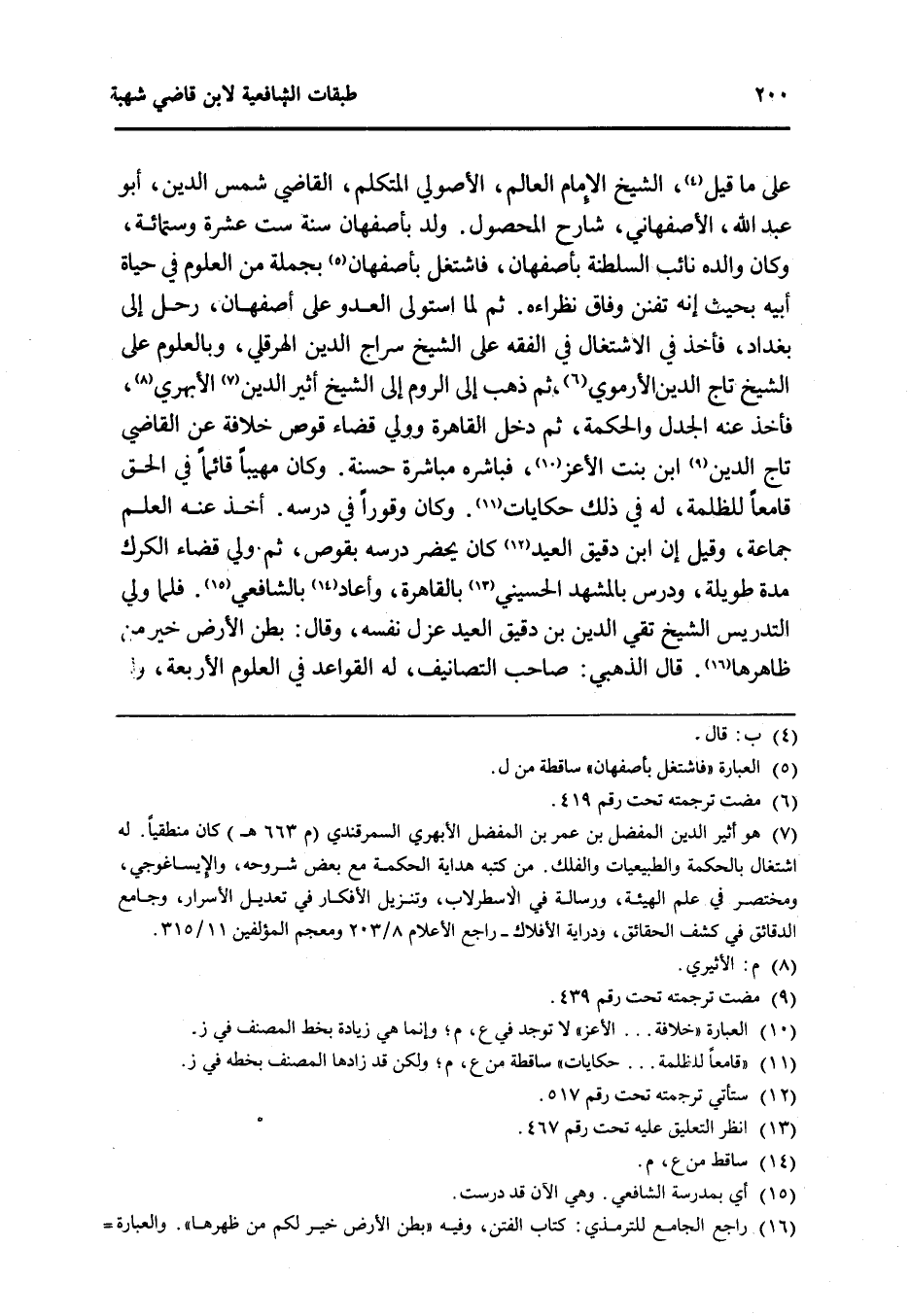 على ماقيل الشَّيْخ الإِمَام الْعَالم الأصولي الْمُتَكَلّم القَاضِي شمس الدَّين أَبُو عبد الله الْأَصْفَهَانِي شَارِح الْمَحْصُول ولد بأصفهان سنة عشرَة وسِتمِائَة وَكَانَ وَالِده نَائِب السلطنة بأصفهان فاشتغل بأصفهان بجملة من الْعُلُوم فِي حَيَاة أَبِيه بِحَيْثُ إِنَّه تفنن وفَاق نظراءه ثمَّ لما استولى الْعَدو على أصفهان رَحل إِلَى بَغْدَاد فَأخذ فِي الِاشْتِغَال فِي الْفِقْه على الشَّيْخ سراج الدَّين الهرقلي وبالعلوم غلى الشَّيْخ تَاج الدَّين الأرموي ثمَّ ذهب إِلَى الرّوم إِلَى الشَّيْخ أثير الدَّين الْأَبْهَرِيّ فَأخذ عَنهُ الجدل وَالْحكمَة ثمَّ دخل الْقَاهِرَة وَولي قَضَاء قوص خلَافَة عَن القَاضِي تَاج الدَّين ابْن بنت الْأَعَز فباشره مُبَاشرَة حَسَنَة وَكَانَ مهيبا قَائِما فِي الْحق قامعا للظلمة لَهُ فِي ذَلِك حكايات وَكَانَ وقورا فِي درسه أَخذ عَنهُ الْعلم جمَاعَة وَقيل إِن ابْن دَقِيق الْعِيد كَانَ يحضر درسه بقوص ثمَّ ولي قَضَاء الكرك مُدَّة طَوِيلَة ودرس بالمشهد الْحُسَيْنِي بِالْقَاهِرَةِ وَأعَاد بالشافعي فَلَمَّا ولي التدريس الشَّيْخ تَقِيّ الدَّين بن دَقِيق الْعِيد عزل نَفسه وَقَالَ بطن الأَرْض خير من ظَاهرهَا قَالَ الذَّهَبِيّ صَاحب التصانيف لَهُ الْقَوَاعِد فِي الْعُلُوم الْأَرْبَعَة وَلم