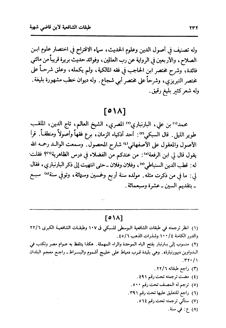 518 - مُحَمَّد بن عَليّ البارنباري الْمصْرِيّ الشَّيْخ الْعَالم تَاج الدَّين الملقب طوير اللَّيْل قَالَ السُّبْكِيّ أحد أذكياء الزَّمَان برع فقها وأصولا ومنطقا قَرَأَ الْأُصُول والمعقول على الْأَصْفَهَانِي شَارِح الْمَحْصُول وَسمعت الْوَالِد رَحمَه الله يَقُول قَالَ لي ابْن الرّفْعَة من عنْدكُمْ من الْفُضَلَاء فِي درس الظَّاهِرِيَّة فَقلت لَهُ قطب الدَّين السنباطي وَفُلَان وَفُلَان حَتَّى انْتَهَيْت إِلَى ذكر البارنباري فَقَالَ لي مَا فِي من ذكرت مثله مولده سنة أَربع وَخمسين وسِتمِائَة وَتُوفِّي سنة سبع بِتَقْدِيم السِّين عشرَة وَسَبْعمائة