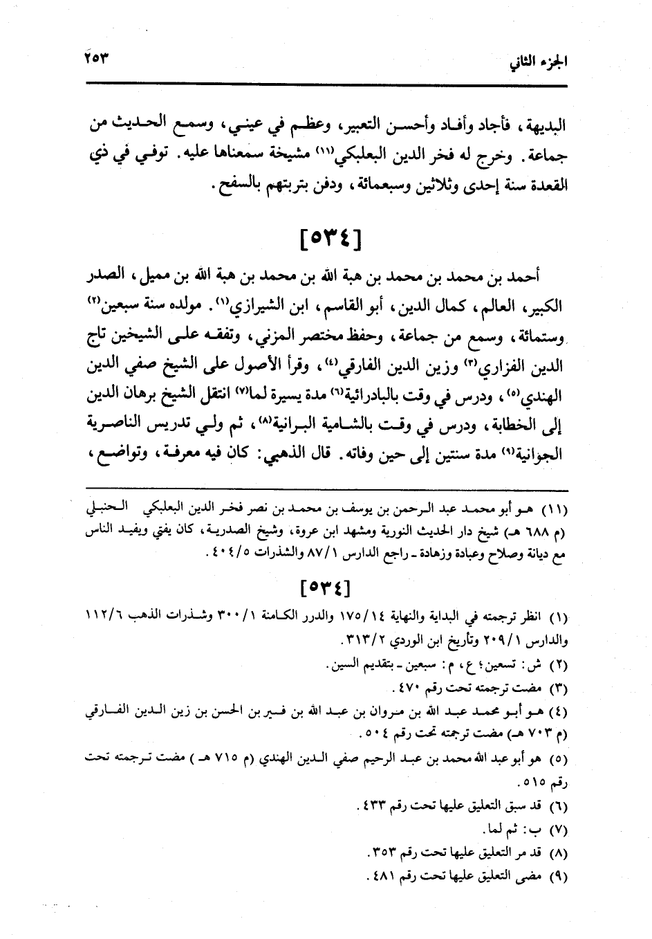 534 - أَحْمد بن مُحَمَّد بن مُحَمَّد بن هبة الله بن مُحَمَّد بن هبة الله بن مميل الصَّدْر الْكَبِير الْعَالم كَمَال الدَّين أَبُو الْقَاسِم ابْن الشِّيرَازِيّ مولده سنة سبعين وسِتمِائَة وَسمع من جمَاعَة وَحفظ مُخْتَصر الْمُزنِيّ وتفقه على الشَّيْخَيْنِ تَاج الدَّين الْفَزارِيّ وزين الدَّين الفارقي وَقَرَأَ الْأُصُول على الشَّيْخ صفي الدَّين الْهِنْدِيّ ودرس فِي وَقت بالبادرائية مُدَّة يسيرَة لما انْتقل الشَّيْخ برهَان الدَّين إِلَى الخطابة ودرس فِي وَقت بالشامية البرانية ثمَّ ولي تدريس الناصرية الجوانية مُدَّة سنتَيْن إِلَى حِين وَفَاته قَالَ الذَّهَبِيّ كَانَ فِيهِ معرفَة وتواضع
