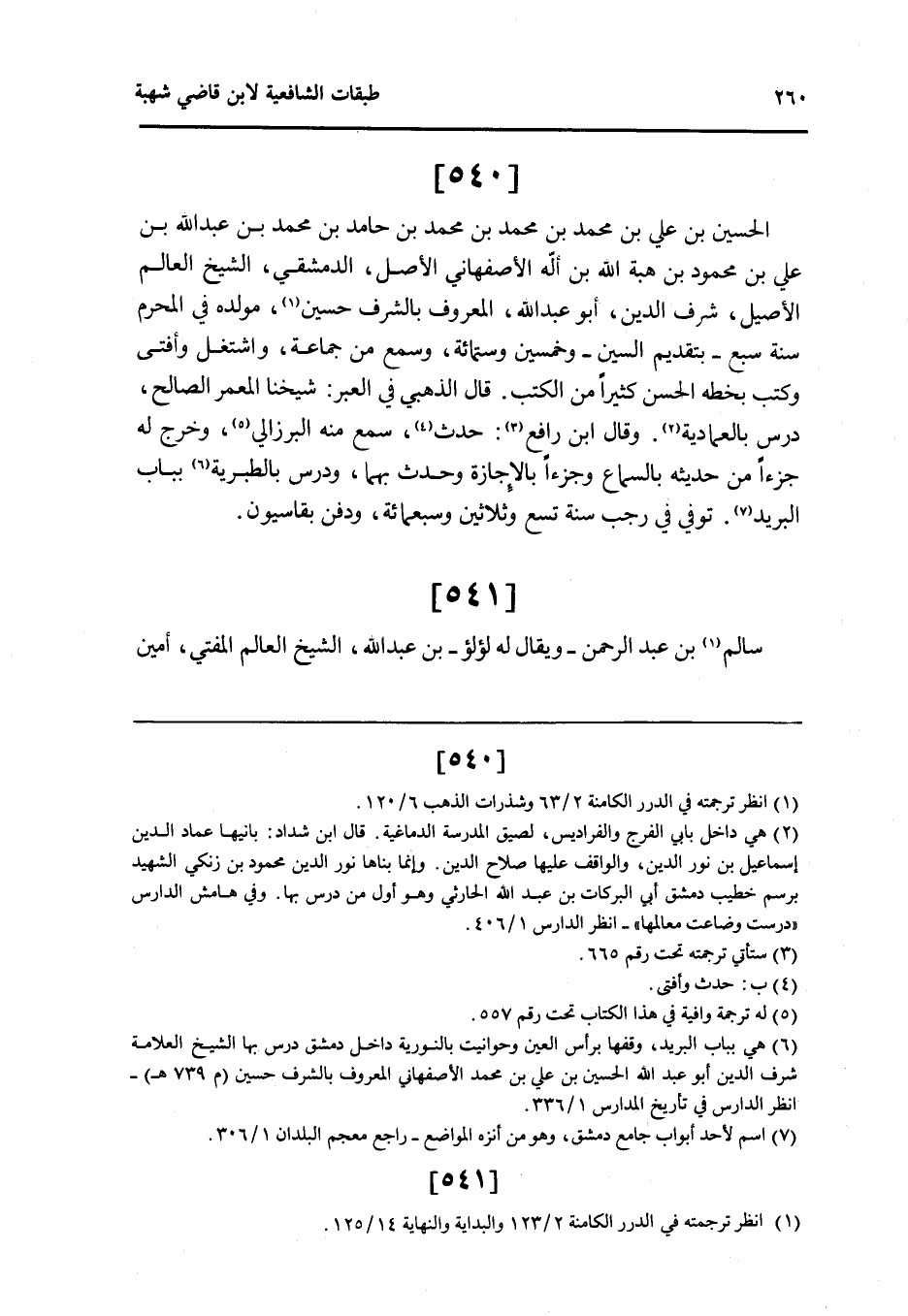 540 - الْحُسَيْن بن عَليّ بن مُحَمَّد بن مُحَمَّد بن مُحَمَّد بن حَامِد بن مُحَمَّد بن عبد الله بن عَليّ بن مَحْمُود بن هبة الله بن أَله الْأَصْفَهَانِي الأَصْل الدِّمَشْقِي الشَّيْخ الْعَالم الْأَصِيل شرف الدَّين أَبُو عبد الله الْمَعْرُوف بالشريف حُسَيْن مولده فِي الْمحرم سنة سبع بِتَقْدِيم السِّين وَخمسين وسِتمِائَة وَسمع من جمَاعَة واشتغل وَأفْتى وَكتب بِخَطِّهِ الْحسن كثيرا من الْكتب قَالَ الذَّهَبِيّ فِي العبر شَيخنَا المعمر الصَّالح درس بالعمادية وَقَالَ ابْن رَافع حدث سمع مِنْهُ البرزالي وَخرج لَهُ جُزْءا من حَدِيثه بِالسَّمَاعِ وجزءا بِالْإِجَازَةِ وَحدث بهما ودرس بالطبرية بِبَاب الْبَرِيد توفّي فِي رَجَب تسع وَثَلَاثِينَ وَسَبْعمائة وَدفن بقاسيون