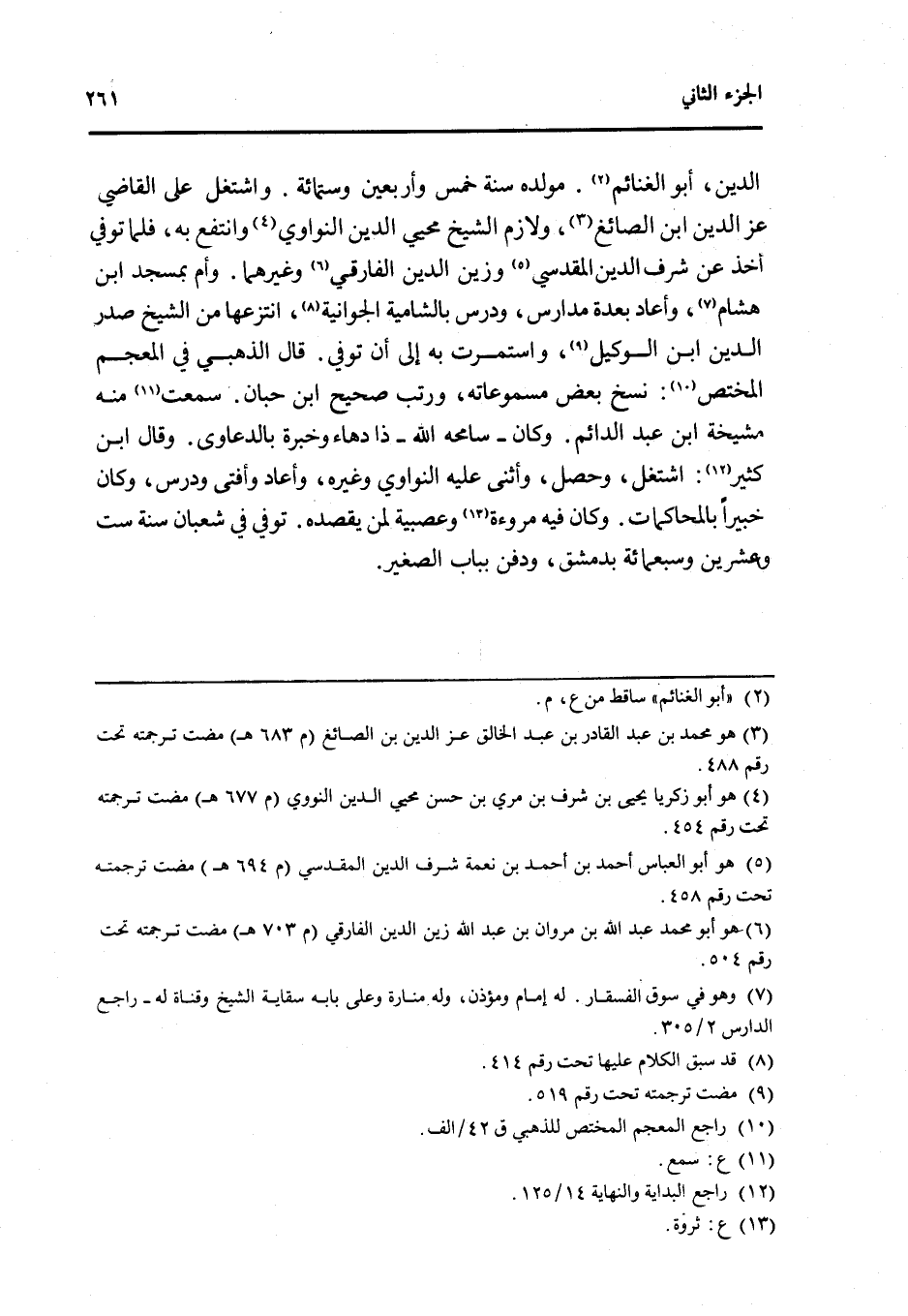 الدَّين أَبُو الْغَنَائِم مولده سنة خمس وَأَرْبَعين وسِتمِائَة واشتغل على القَاضِي عز الدَّين ابْن الصَّائِغ ولازم الشَّيْخ محيي الدَّين النواوي وانتفع بِهِ فَلَمَّا توفّي أَخذ عَن شرف الدَّين الْمَقْدِسِي وزين الدَّين الفارقي وَغَيرهمَا وَأم بِمَسْجِد ابْن هِشَام وَأعَاد بعدة مدارس ودرس بالشامية الجوانية انتزعها من الشَّيْخ صدر الدَّين ابْن الْوَكِيل واستمرت بِهِ إِلَى أَن توفّي قَالَ الذَّهَبِيّ فِي المعجم الْمُخْتَص نسخ بعض مسموعاته ورتب صَحِيح ابْن حبَان سَمِعت مِنْهُ مشيخة ابْن عبد الدَّائِم وَكَانَ سامحه الله ذَا دهاء وخبرة بالدعاوى وَقَالَ ابْن كثير اشْتغل وَحصل وَأثْنى عَلَيْهِ النواوي وَغَيره وَأعَاد وَأفْتى ودرس وَكَانَ خَبِيرا بالمحاكمات وَكَانَ فِيهِ مُرُوءَة وعصبية لمن يَقْصِدهُ توفّي فِي شعْبَان سنة سِتّ وَعشْرين وَسَبْعمائة بِدِمَشْق وَدفن بِبَاب الصَّغِير