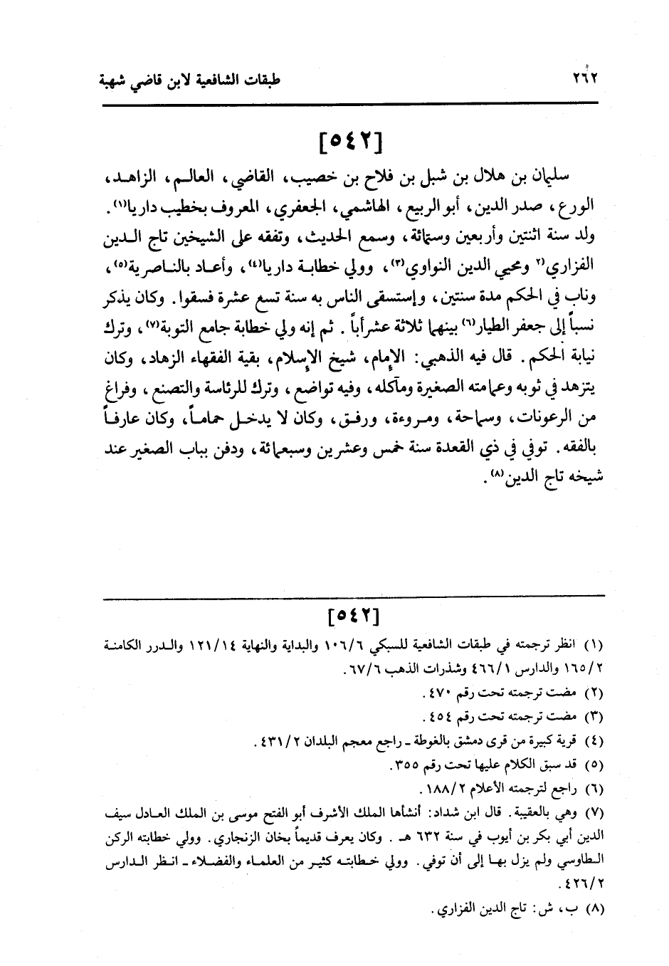 542 - سُلَيْمَان بن هِلَال بن شبْل بن فلاح بن خصيب القَاضِي الْعَالم الزَّاهِد الْوَرع صدر الدَّين أَبُو الرّبيع الْهَاشِمِي الْجَعْفَرِي الْمَعْرُوف بخطيب داريا ولد سنة اثْنَتَيْنِ وَأَرْبَعين وسِتمِائَة وَسمع الحَدِيث وتفقه على الشَّيْخَيْنِ تَاج الدَّين الْفَزارِيّ ومحيي الدَّين النواوي وَولي خطابة داريا وَأعَاد بالناصرية وناب فِي الحكم مُدَّة سنتَيْن وإستسقى النَّاس بِهِ سنة تسع عشرَة فسقوا وَكَانَ يذكر نسبا إِلَى جَعْفَر الطيار بَينهمَا ثَلَاثَة عشر أَبَا ثمَّ إِنَّه ولي خطابة جَامع التَّوْبَة وَترك نِيَابَة الحكم قَالَ فِيهِ الذَّهَبِيّ الإِمَام شيخ الْإِسْلَام بَقِيَّة الْفُقَهَاء الزهاد وَكَانَ يتزهد فِي ثَوْبه وعمامته الصَّغِيرَة ومآكله وَفِيه تواضع وَترك للرئاسة والتصنع وفراغ من الرعونات وسماحة ومروءة ورفق وَكَانَ لَا يدْخل حَماما وَكَانَ عَارِفًا بالفقه توفّي فِي ذِي الْقعدَة سنة خمس وَعشْرين وَسَبْعمائة وَدفن بِبَاب الصَّغِير عِنْد شَيْخه تَاج الدَّين
