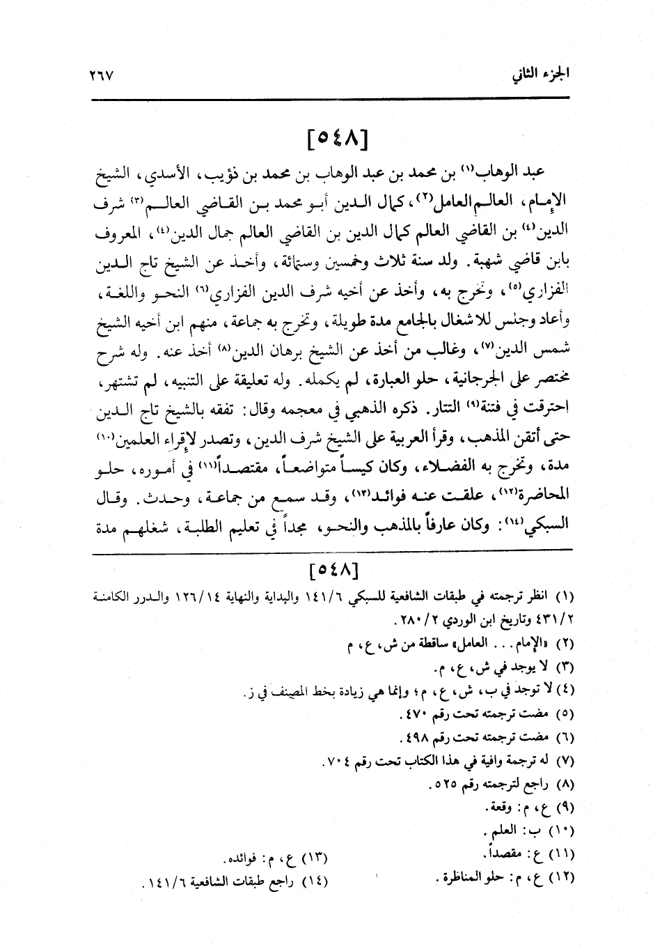 548 - عبد الْوَهَّاب بن مُحَمَّد بن عبد الْوَهَّاب بن مُحَمَّد بن ذُؤَيْب الْأَسدي الشَّيْخ الإِمَام الْعَالم الْعَامِل كَمَال الدَّين أَبُو مُحَمَّد بن القَاضِي الْعَالم شرف الدَّين بن القَاضِي الْعَالم كَمَال الدَّين بن القَاضِي الْعَالم جمال الدَّين الْمَعْرُوف بِابْن قَاضِي شُهْبَة ولد سنة ثَلَاث وَخمسين وسِتمِائَة وَأخذ عَن الشَّيْخ تَاج الدَّين الْفَزارِيّ وَتخرج بِهِ وَأخذ عَن أَخِيه شرف الدَّين الفزراي النَّحْو واللغة وَأعَاد وَجلسَ للاشغال بالجامع مُدَّة طَوِيلَة وَتخرج بِهِ جمَاعَة مِنْهُم ابْن أَخِيه الشَّيْخ شمس الدَّين وغالب من أَخذ عَن الشَّيْخ برهَان الدَّين أَخذ عَنهُ وَله شرح مُخْتَصر على الجرجانية حُلْو الْعبارَة لم يكمله وَله تعليقة على التَّنْبِيه لم تشتهر احترقت فِي فتْنَة التتار ذكره الذَّهَبِيّ فِي مُعْجَمه وَقَالَ تفقه بالشيخ تَاج الدَّين حَتَّى أتقن الْمَذْهَب وَقَرَأَ الْعَرَبيَّة على الشَّيْخ شرف الدَّين وتصدر لإقراء العلمين مُدَّة وَتخرج بِهِ الْفُضَلَاء وَكَانَ كيسا متواضعا مقتصدا فِي أُمُوره حُلْو المحاضرة علقت عَنهُ فَوَائِد وَقد سمع من جمَاعَة وَحدث وَقَالَ السُّبْكِيّ وَكَانَ عَارِفًا بِالْمذهبِ والنحو مجدا فِي تَعْلِيم الطّلبَة شغلهمْ مُدَّة