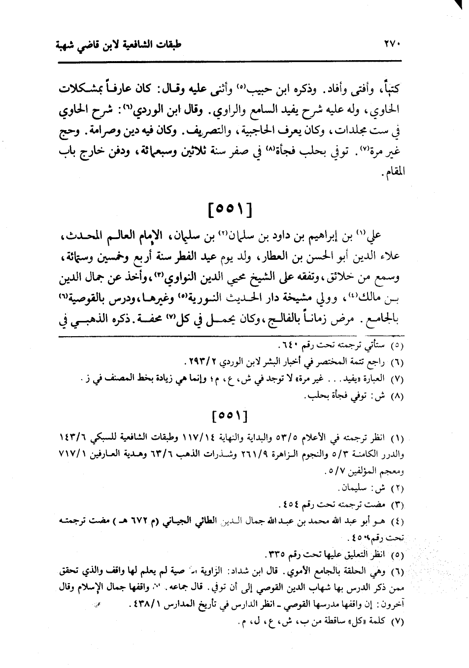 551 - عَليّ بن إِبْرَاهِيم بن دَاوُد بن سلمَان بن سُلَيْمَان الإِمَام الْعَالم الْمُحدث عَلَاء الدَّين أَبُو الْحسن بن الْعَطَّار ولد يَوْم عيد الْفطر سنة أَربع وَخمسين وسِتمِائَة وَسمع من خلائق وتفقه على الشَّيْخ محيي الدَّين النواوي وَأخذ عَن جمال الدَّين بن مَالك وَولي مشيخة دَار الحَدِيث النورية وَغَيرهَا ودرس بالقوصية بالجامع مرض زَمَانا بالفالج وَكَانَ يحمل فِي كل محفة ذكره الذَّهَبِيّ فِي