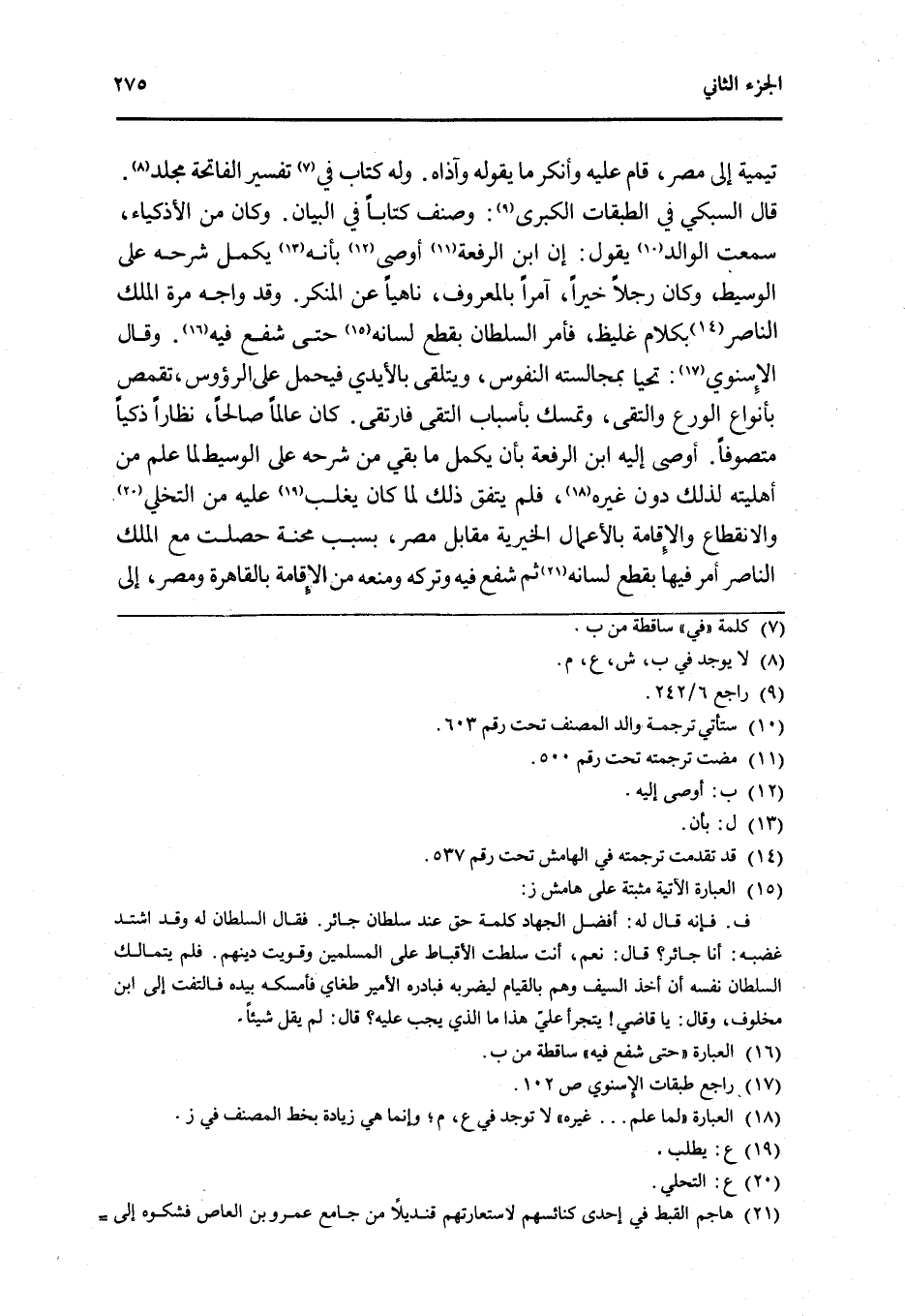 تَيْمِية إِلَى مصر قَامَ عَلَيْهِ وَأنكر مَا يَقُوله وآذاه وَله كتاب فِي تَفْسِير الْفَاتِحَة مُجَلد قَالَ السُّبْكِيّ فِي الطَّبَقَات الْكُبْرَى وصنف كتابا فِي الْبَيَان وَكَانَ من الأذكياء سَمِعت الْوَالِد يَقُول إِن ابْن الرّفْعَة أوصى بِأَنَّهُ يكمل شَرحه على الْوَسِيط وَكَانَ رجلا خيرا آمرا بِالْمَعْرُوفِ ناهيا عَن الْمُنكر وَقد واجه مرّة الْملك النَّاصِر بِكَلَام غليظ فَأمر السُّلْطَان بِقطع لِسَانه حَتَّى شفع فِيهِ وَقَالَ الْإِسْنَوِيّ تحيا بمجالسته النُّفُوس ويتلقى بِالْأَيْدِي فَيحمل على الرؤوس تقمص بأنواع الْوَرع والتقى وَتمسك بِأَسْبَاب التقى فارتقى كَانَ عَالما صَالحا نظارا ذكيا متصوفا أوصى إِلَيْهِ ابْن الرّفْعَة بِأَن يكمل مَا بَقِي من شَرحه على الْوَسِيط لما علم من أَهْلِيَّته لذَلِك دون غَيره فَلم يتَّفق ذَلِك لما كَانَ يغلب عَلَيْهِ من التخلي والانقطاع وَالْإِقَامَة بِالْأَعْمَالِ الْخَيْرِيَّة مُقَابل مصر بِسَبَب محنة حصلت مَعَ الْملك النَّاصِر أَمر فِيهَا بِقطع لِسَانه ثمَّ شفع فِيهِ وَتَركه وَمنعه من الْإِقَامَة بِالْقَاهِرَةِ ومصر إِلَى