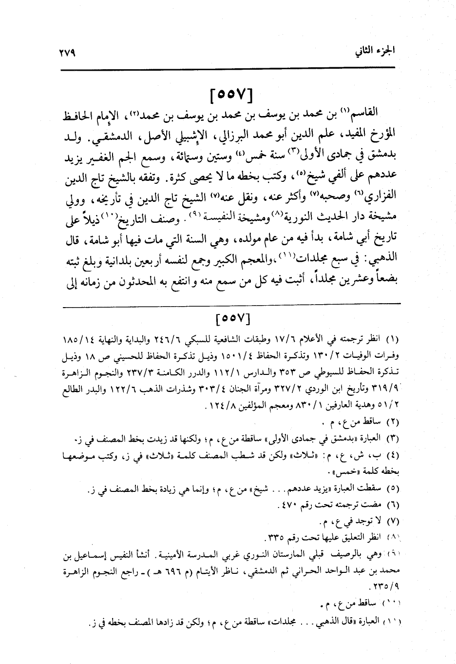 557 - الْقَاسِم بن مُحَمَّد بن يُوسُف بن مُحَمَّد بن يُوسُف بن مُحَمَّد الإِمَام الْحَافِظ المؤرخ الْمُفِيد علم الدَّين أَبُو مُحَمَّد البرزالي الإشبيلي الأَصْل الدِّمَشْقِي ولد بِدِمَشْق فِي جُمَادَى الأولى سنة خمس وَسِتِّينَ وسِتمِائَة وَسمع الجم الْغَفِير يزِيد عَددهمْ على ألفي شيخ وَكتب بِخَطِّهِ مَا لَا يُحْصى كَثْرَة وتفقه بالشيخ تَاج الدَّين الْفَزارِيّ وَصَحبه وَأكْثر عَنهُ وَنقل عَنهُ الشَّيْخ تَاج الدَّين فِي تأريخه وَولي مشيخة دَار الحَدِيث النورية ومشيخة النفيسة وصنف التَّارِيخ ذيلا على تَارِيخ أبي شامة بَدَأَ فِيهِ من عَام مولده وَهِي السّنة الَّتِي مَاتَ فِيهَا أَبُو شامة قَالَ الذَّهَبِيّ فِي سبع مجلدات والمعجم الْكَبِير وَجمع لنَفسِهِ أَرْبَعِينَ بلدانية وَبلغ ثبته بضعا وَعشْرين مجلدا أثبت فِيهِ كل من سمع مِنْهُ وانتفع بِهِ المحدثون من زَمَانه إِلَى