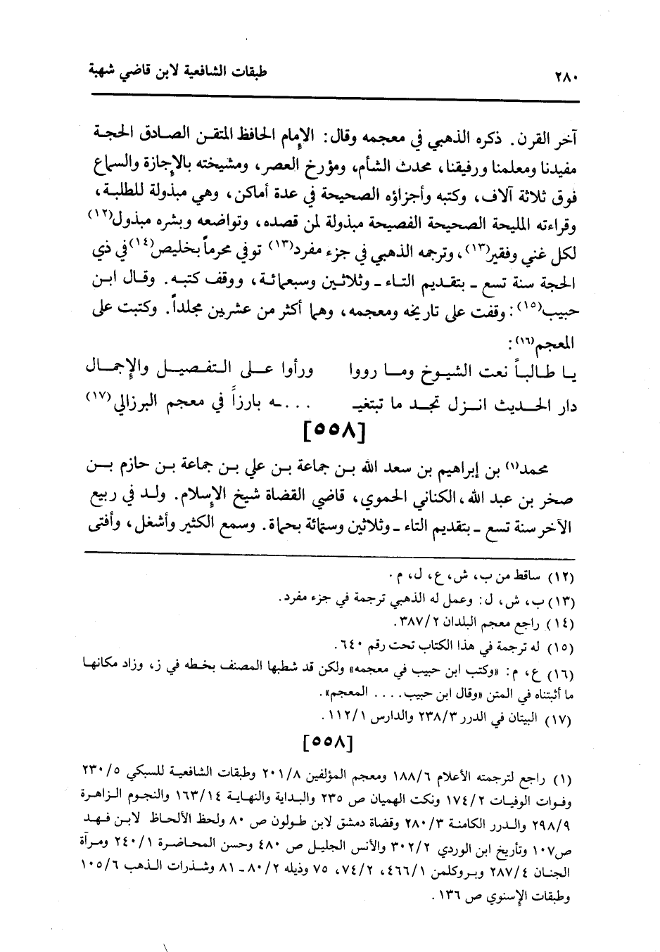 558 - مُحَمَّد بن إِبْرَاهِيم بن سعد الله بن جمَاعَة بن عَليّ بن جمَاعَة بن حَازِم بن صَخْر بن عبد الله الْكِنَانِي الْحَمَوِيّ قَاضِي الْقُضَاة شيخ الْإِسْلَام ولد فِي ربيع الآخر سنة تسع بِتَقْدِيم التَّاء وَثَلَاثِينَ وسِتمِائَة بحماة وَسمع الْكثير واشغل وَأفْتى