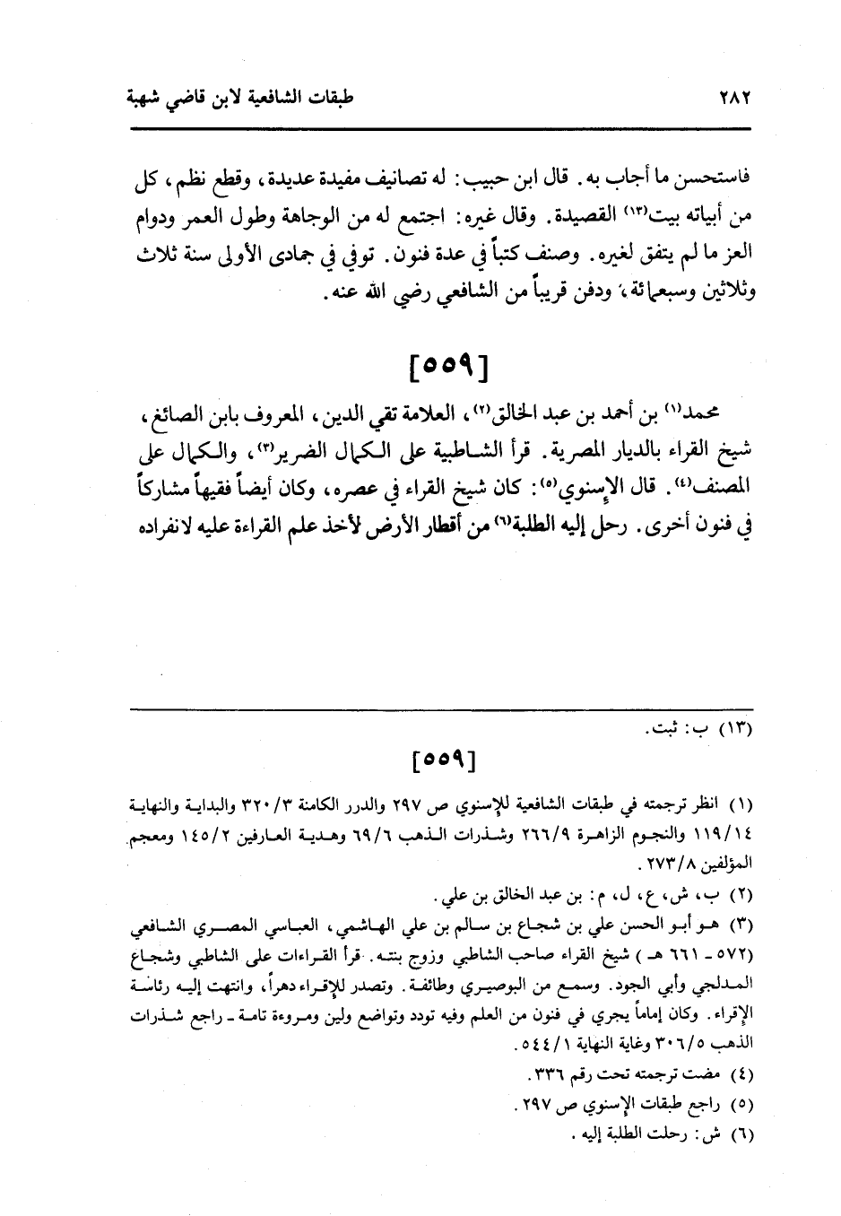 559 - مُحَمَّد بن احْمَد بن عبد الْخَالِق الْعَلامَة تَقِيّ الدَّين الْمَعْرُوف بِابْن الصَّائِغ شيخ الْقُرَّاء بالديار المصرية قَرَأَ الشاطبية على الْكَمَال الضَّرِير والكمال على المُصَنّف قَالَ الْإِسْنَوِيّ كَانَ شيخ الْقُرَّاء فِي عصره وَكَانَ أَيْضا فَقِيها مشاركا فِي فنون أُخْرَى رَحل إِلَيْهِ الطّلبَة من أقطار الأَرْض لأخذ علم الْقِرَاءَة عَلَيْهِ لانفراده