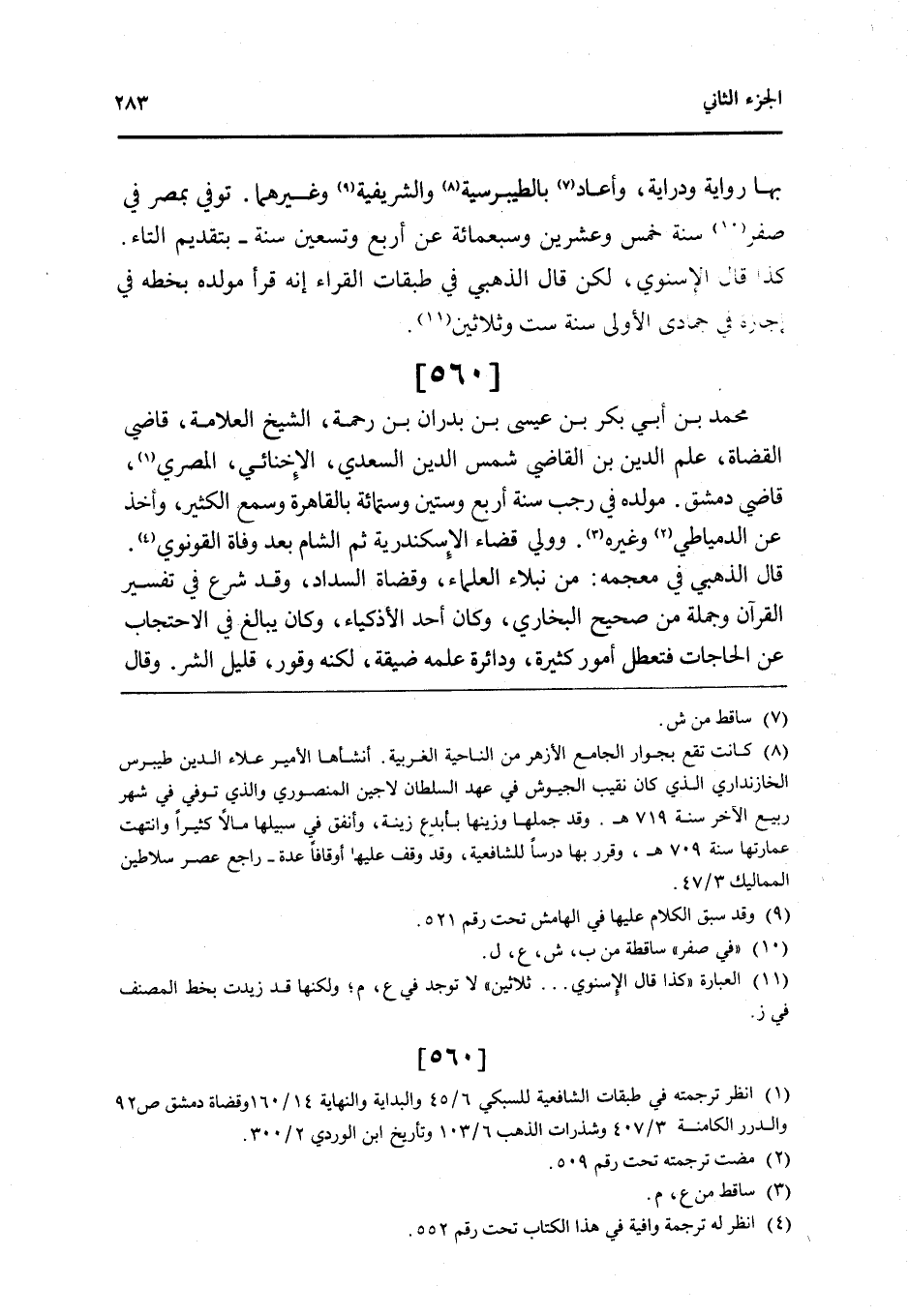 560 - مُحَمَّد بن أبي بكر بن عِيسَى بن بدران بن رَحْمَة الشَّيْخ الْعَلامَة قَاضِي الْقُضَاة علم الدَّين بن القَاضِي شمس الدَّين السَّعْدِيّ الإخنائي الْمصْرِيّ قَاضِي دمشق مولده فِي رَجَب سنة أَربع وَسِتِّينَ وسِتمِائَة بِالْقَاهِرَةِ وَسمع الْكثير وَأخذ عَن الدمياطي وَغَيره وَولي قَضَاء الْإسْكَنْدَريَّة ثمَّ الشَّام بعد وَفَاة القونوي قَالَ الذَّهَبِيّ فِي مُعْجَمه من نبلاء الْعلمَاء وقضاة السداد وَقد شرع فِي تَفْسِير الْقُرْآن وَجُمْلَة من صَحِيح البُخَارِيّ وَكَانَ أحد الأذكياء وَكَانَ يُبَالغ فِي الاحتجاب عَن الْحَاجَات فتعطل أُمُور كَثِيرَة ودائرة علمه ضيقَة لكنه وقور قَلِيل الشَّرّ وَقَالَ