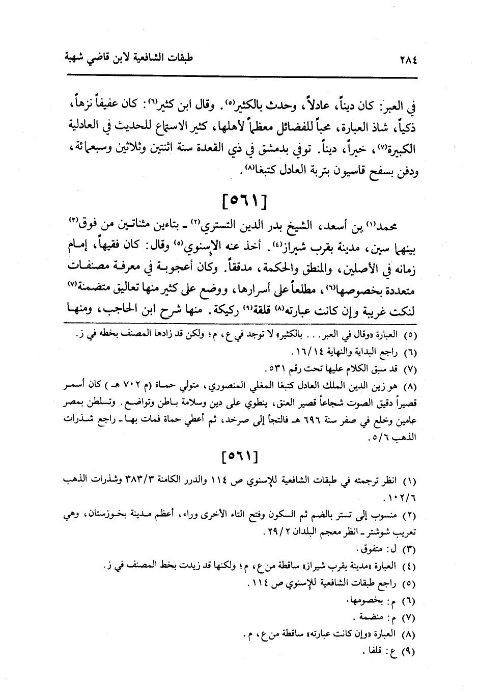 561 - مُحَمَّد بن أسعد الشَّيْخ بدر الدَّين التسترِي بتاءين مثناتين من فَوق بَينهمَا سين مَدِينَة بِقرب شيراز أَخذ عَنهُ الْإِسْنَوِيّ وَقَالَ كَانَ فَقِيها إِمَام زَمَانه فِي الْأَصْلَيْنِ والمنطق وَالْحكمَة مدققا وَكَانَ أعجوبة فِي معرفَة مصنفات مُتعَدِّدَة بخصوصها مطلعا على أسرارها وَوضع على كثير مِنْهَا تعاليق متضمنة لنكت غَرِيبَة وَإِن كَانَت عِبَارَته قلقة ركيكة مِنْهَا شرح ابْن الْحَاجِب وَمِنْهَا