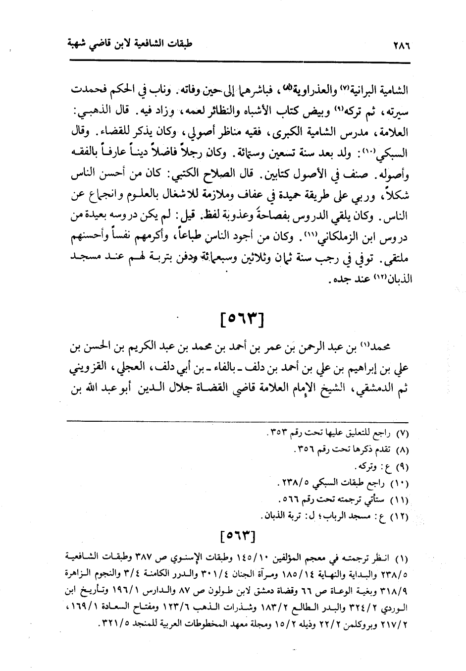 563 - مُحَمَّد بن عبد الرَّحْمَن بن عمر بن أَحْمد بن مُحَمَّد بن عبد الْكَرِيم بن الْحسن بن عَليّ بن إِبْرَاهِيم بن عَليّ بن أَحْمد بن دلف بِالْفَاءِ بن أبي دلف الْعجلِيّ الْقزْوِينِي ثمَّ الدِّمَشْقِي الشَّيْخ الإِمَام الْعَلامَة قَاضِي الْقُضَاة جلال الدَّين أَبُو عبد الله بن