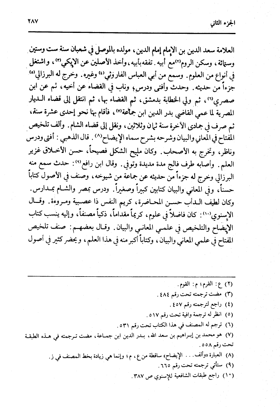 الْعَلامَة سعد الدَّين بن الإِمَام إِمَام الدَّين مولده بالموصل فِي شعْبَان سنة سِتّ وَسِتِّينَ وسِتمِائَة وَسكن الرّوم مَعَ أَبِيه تفقه بِأَبِيهِ وَأخذ الْأَصْلَيْنِ عَن الإيكي واشتغل فِي أَنْوَاع من الْعُلُوم وَسمع من أبي الْعَبَّاس الفاروثي وَغَيره وَخرج لَهُ البرزالي جُزْءا من حَدِيثه وَحدث وَأفْتى ودرس وناب فِي الْقَضَاء عَن اخيه ثمَّ عَن ابْن صصري ثمَّ ولي الخطابة بِدِمَشْق ثمَّ الْقَضَاء بهَا ثمَّ انْتقل إِلَى قَضَاء الديار المصرية لما عمي القَاضِي بدر الدَّين ابْن جمَاعَة فَأَقَامَ بهَا نَحْو إِحْدَى عشرَة سنة ثمَّ صرف فِي جُمَادَى الْآخِرَة سنة ثَمَان وَثَلَاثِينَ وَنقل إِلَى قَضَاء الشَّام وَألف تَلْخِيص الْمِفْتَاح فِي الْمعَانِي وَالْبَيَان وَشَرحه بشرح سَمَّاهُ الْإِيضَاح قَالَ الذَّهَبِيّ أفتى ودرس وناظر وَتخرج بِهِ الْأَصْحَاب وَكَانَ مليح الشكل فصيحا حسن الْأَخْلَاق غزير الْعلم وأصابه طرف فالج مُدَّة مديدة وَتُوفِّي وَقَالَ ابْن رَافع حدث سمع مِنْهُ البرزالي وَخرج لَهُ جُزْءا من حَدِيثه عَن جمَاعَة من شُيُوخه وصنف فِي الْأُصُول كتابا حسنا وَفِي الْمعَانِي وَالْبَيَان كتابين كَبِيرا وصغيرا ودرس بِمصْر وَالشَّام بمدارس وَكَانَ لطيف الدأب حسن المحاضرة كريم النَّفس ذَا عصبية ومروءة وَقَالَ الْإِسْنَوِيّ كَانَ فَاضلا فِي عُلُوم كَرِيمًا مقداما ذكيا مصنفا وَإِلَيْهِ ينْسب كتاب الْإِيضَاح وَالتَّلْخِيص فِي علمي الْمعَانِي وَالْبَيَان وَقَالَ بَعضهم صنف تَلْخِيص الْمِفْتَاح فِي علمي الْمعَانِي وَالْبَيَان وكتابا أكبر مِنْهُ فِي هَذَا الْعلم ويحضر كثير فِي أصُول