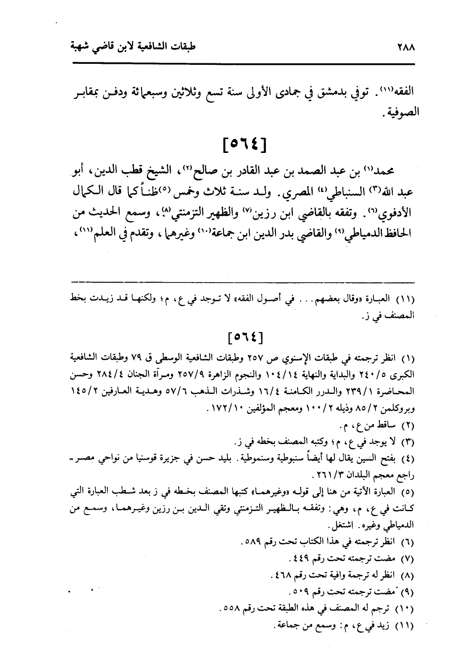 564 - مُحَمَّد بن عبد الصَّمد بن عبد الْقَادِر بن صَالح الشَّيْخ قطب الدَّين أَبُو عبد الله السنباطي الْمصْرِيّ ولد سنة ثَلَاث وَخمْس ظنا كَمَا قَالَ الْكَمَال الأدفوي وتفقه بِالْقَاضِي ابْن رزين والظهير التزمنتي وَسمع الحَدِيث من الْحَافِظ الدمياطي وَالْقَاضِي بدر الدَّين ابْن جمَاعَة وَغَيرهمَا وَتقدم فِي الْعلم