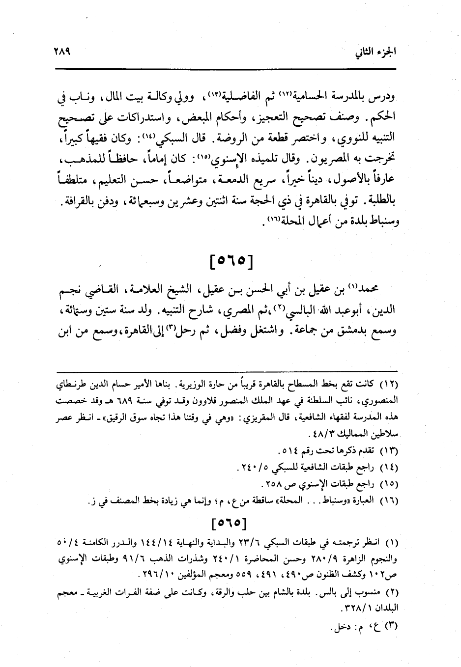 565 - مُحَمَّد بن عقيل بن أبي الْحسن بن عقيل الشَّيْخ الْعَلامَة القَاضِي نجم الدَّين أَبُو عبد الله البالسي ثمَّ الْمصْرِيّ شَارِح التَّنْبِيه ولد سنة سِتِّينَ وسِتمِائَة وَسمع بِدِمَشْق من جمَاعَة واشتغل وَفضل ثمَّ رَحل إِلَى الْقَاهِرَة وَسمع من ابْن