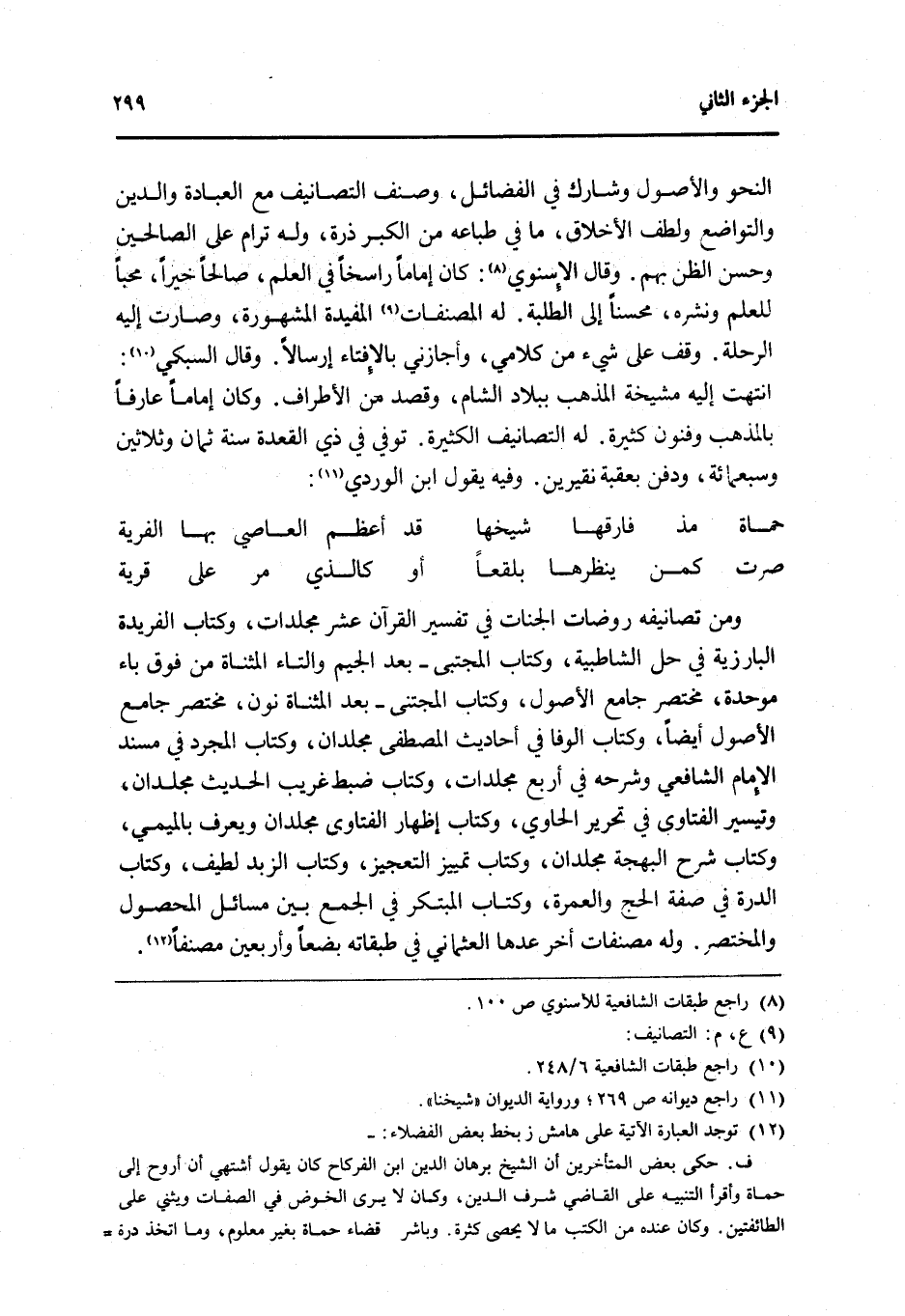 النَّحْو وَالْأُصُول وشارك فِي الْفَضَائِل وصنف التصانيف مَعَ الْعِبَادَة وَالدّين والتواضع ولطف الْأَخْلَاق مَا فِي طباعه من الْكبر ذرة وَله ترام على الصَّالِحين وَحسن الظَّن بهم وَقَالَ الْإِسْنَوِيّ كَانَ إِمَامًا راسخا فِي الْعلم صَالحا خيرا محبا للْعلم ونشره محسنا إِلَى الطّلبَة لَهُ المصنفات المفيدة الْمَشْهُورَة وَصَارَت إِلَيْهِ الرحلة وقف على شَيْء من كَلَامي وأجازني بالإفتاء إرْسَالًا وَقَالَ السُّبْكِيّ انْتَهَت إِلَيْهِ مشيخة الْمَذْهَب بِبِلَاد الشَّام وَقصد من الْأَطْرَاف وَكَانَ إِمَامًا عَارِفًا بِالْمذهبِ وفنون كَثِيرَة لَهُ التصانيف الْكَثِيرَة توفّي فِي ذِي الْقعدَة سنة ثَمَان وَثَلَاثِينَ وَسَبْعمائة وَدفن بعقبة نقيرين وَفِيه يَقُول ابْن الوردي ... حماة مذ فَارقهَا شيخها ... قد أعظم العَاصِي بهَا الْفِرْيَة ... ... صرت كمن ينظرها بلقعا ... أَو كَالَّذي مر على قَرْيَة ...