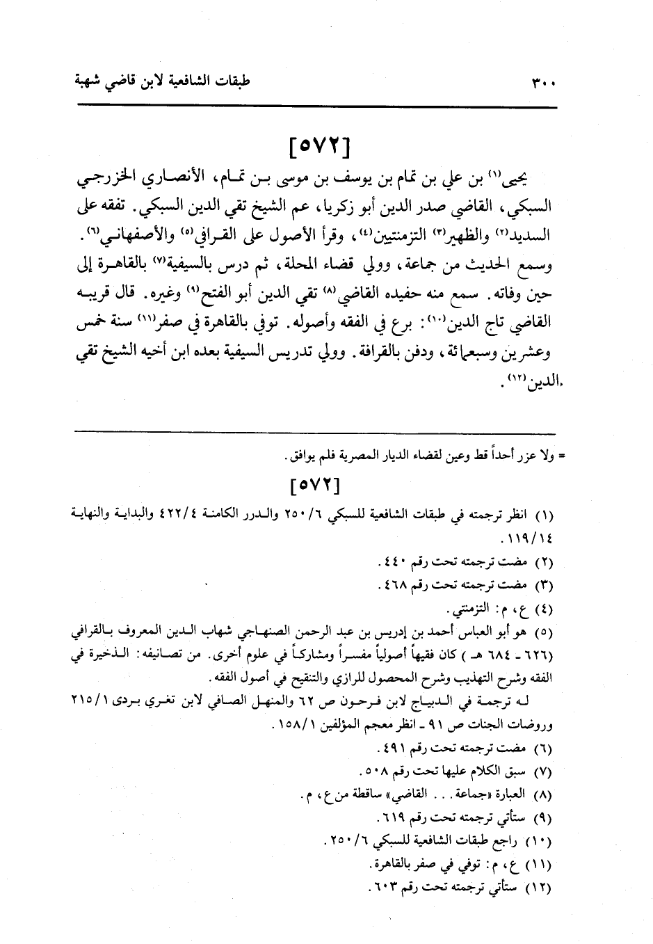 572 - يحيى بن عَليّ بن تَمام بن يُوسُف بن مُوسَى بن تَمام الْأنْصَارِيّ الخزرجي السُّبْكِيّ القَاضِي صدر الدَّين ابو زَكَرِيَّا عَم الشَّيْخ تَقِيّ الدَّين السُّبْكِيّ تفقه على السديد والظهير التزمنتيين وَقَرَأَ الْأُصُول على الْقَرَافِيّ والأصفهاني وَسمع الحَدِيث من جمَاعَة وَولي قَضَاء الْمحلة ثمَّ درس بالسيفية بِالْقَاهِرَةِ إِلَى حِين وَفَاته سمع مِنْهُ حفيده القَاضِي تَقِيّ الدَّين ابو الْفَتْح وَغَيره قَالَ قَرِيبه القَاضِي تَاج الدَّين برع فِي الْفِقْه وأصوله توفّي بِالْقَاهِرَةِ فِي صفر سنة خمس وَعشْرين وَسَبْعمائة وَدفن بالقرافة وَولي تدريس السيفية بعده ابْن اخيه الشَّيْخ تَقِيّ الدَّين