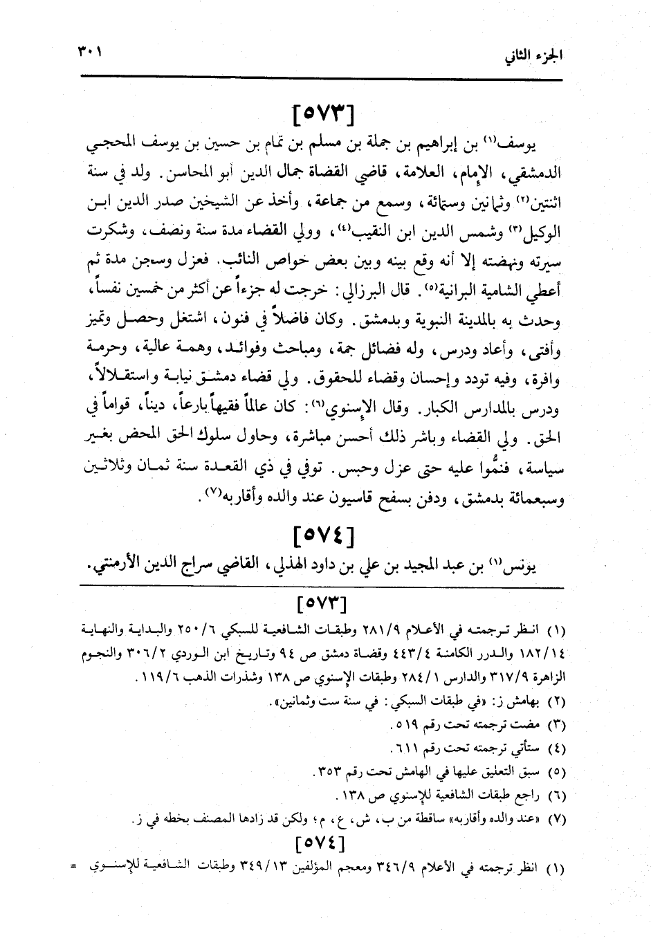 573 - يُوسُف بن إِبْرَاهِيم بن جملَة بن مُسلم بن تَمام بن حُسَيْن بن يُوسُف المحجي الدِّمَشْقِي الإِمَام الْعَلامَة قَاضِي الْقُضَاة جمال الدَّين أَبُو المحاسن ولد فِي سنه اثْنَتَيْنِ وَثَمَانِينَ وسِتمِائَة وَسمع من جمَاعَة وَأخذ عَن الشَّيْخَيْنِ صدر الدَّين ابْن الْوَكِيل وشمس الدَّين ابْن النَّقِيب النقيبى وَولي الْقَضَاء مُدَّة سنة وَنصف وشكرت سيرته ونهضته إِلَّا انه وَقع بَينه وَبَين بعض خَواص النَّائِب فعزل وسجن مُدَّة ثمَّ اعطي الشامية البرانية قَالَ البرزالي خرجت لَهُ جُزْءا عَن اكثر من خمسين نفسا وَحدث بِهِ بِالْمَدِينَةِ النَّبَوِيَّة وبدمشق وَكَانَ فَاضلا فِي فنون اشْتغل وَحصل وتميز وَأفْتى وَأعَاد ودرس وَله فَضَائِل جمة ومباحث وفوائد وهمة عالية وَحُرْمَة وافرة وَفِيه تودد وإحسان وَقَضَاء للحقوق ولي قَضَاء دمشق نِيَابَة واستقلالا ودرس بالمدارس الْكِبَار وَقَالَ الْإِسْنَوِيّ كَانَ عَالما فَقِيها بارعا دينا قواما فِي الْحق ولي الْقَضَاء وباشر ذَلِك احسن مُبَاشرَة وحاول سلوك الْحق الْمَحْض بِغَيْر سياسة فنموا عَلَيْهِ حَتَّى عزل وَحبس توفّي فِي ذِي الْقعدَة سنة ثَمَان وَثَلَاثِينَ وَسَبْعمائة بِدِمَشْق وَدفن بسفح قاسيون عِنْد وَالِده وأقاربه