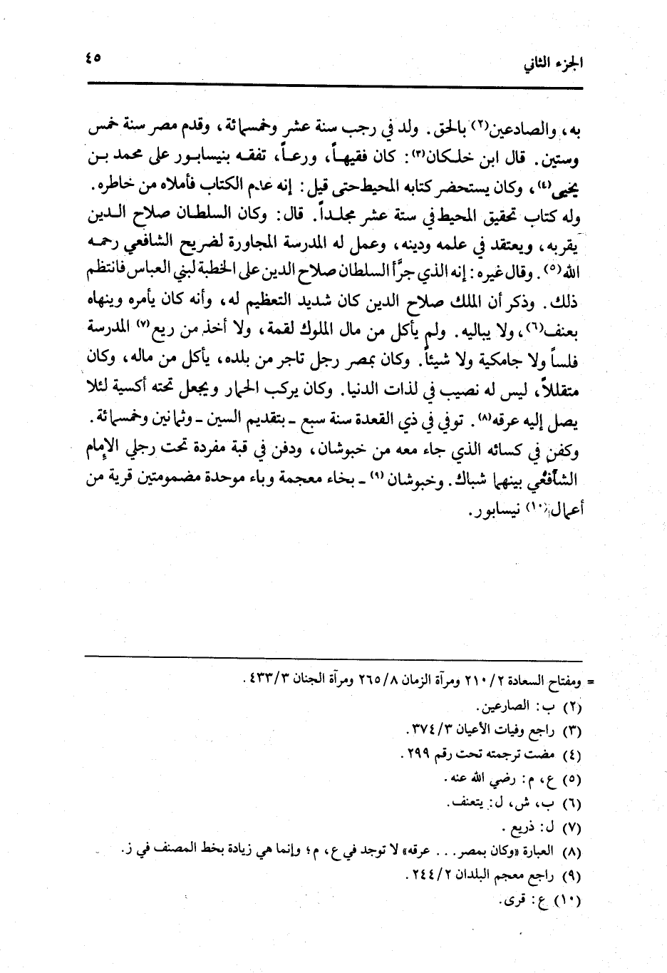 بِهِ والصادعين بِالْحَقِّ ولد فِي رَجَب سنة عشر وَخَمْسمِائة وَقدم مصر سنة خمس وَسِتِّينَ قَالَ ابْن خلكان كَانَ فَقِيها ورعا تفقه بنيسابور على مُحَمَّد بن يحيى وَكَانَ يستحضر كِتَابه الْمُحِيط حَتَّى قيل إِنَّه عدم الْكتاب فأملاه من خاطره وَله كتاب تَحْقِيق الْمُحِيط فِي سِتَّة عشر مجلدا قَالَ وَكَانَ السُّلْطَان صَلَاح الدَّين يقربهُ ويعتقد فِي علمه وَدينه وَعمل لَهُ الْمدرسَة الْمُجَاورَة لضريح الشَّافِعِي رَحمَه الله وَقَالَ غَيره إِنَّه الَّذِي جرأ السُّلْطَان صَلَاح الدَّين على الْخطْبَة لبني الْعَبَّاس فانتظم ذَلِك وَذكر أَن الْملك صَلَاح الدَّين كَانَ شَدِيد التَّعْظِيم لَهُ وَأَنه كَانَ يَأْمُرهُ وينهاه بعنف وَلَا يباليه وَلم يَأْكُل من مَال الْمُلُوك لقْمَة وَلَا أَخذ من ريع الْمدرسَة فلسًا وَلَا جامكية وَلَا شَيْئا وَكَانَ بِمصْر رجل تَاجر من بَلَده يَأْكُل من مَاله وَكَانَ متقللا لَيْسَ لَيْسَ لَهُ نصيب فِي لذات الدُّنْيَا وَكَانَ يركب الْحمار وَيجْعَل تَحْتَهُ أكسية لِئَلَّا يصل إِلَيْهِ عرقه توفّي فِي ذِي الْقعدَة سنة سبع بِتَقْدِيم السِّين وَثَمَانِينَ وَخَمْسمِائة وكفن فِي كسائه الَّذِي جَاءَ مَعَه من خبوشان وَدفن فِي قبَّة مُفْردَة تَحت رجْلي الإِمَام الشَّافِعِي بَينهمَا شباك وخبوشان بخاء مُعْجمَة وباء مُوَحدَة مضمومتين قَرْيَة من أَعمال نيسابور