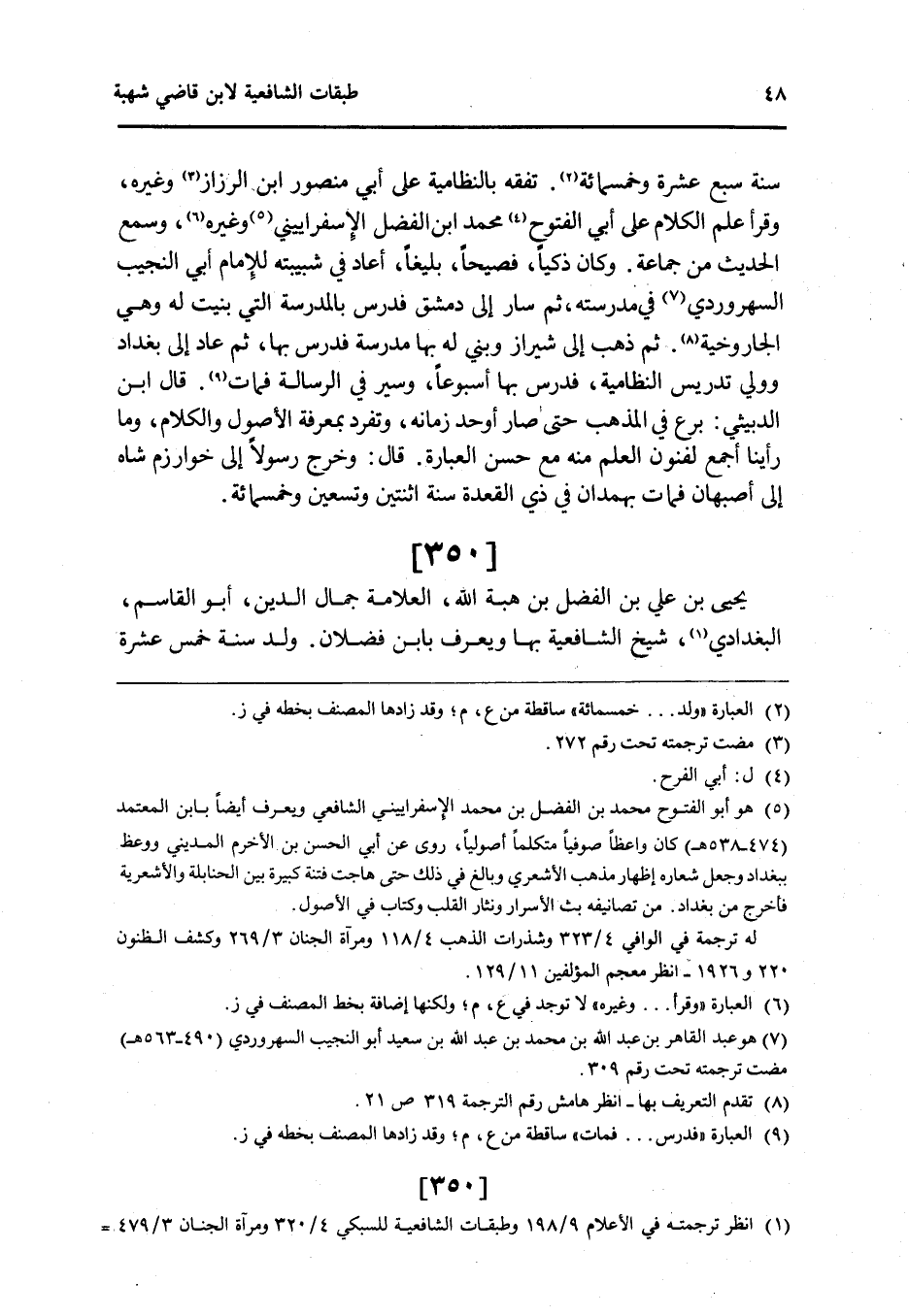 350 - يحيى بن عَليّ بن الْفضل بن هبة الله الْعَلامَة جمال الدَّين أَبُو الْقَاسِم الْبَغْدَادِيّ شيخ الشَّافِعِيَّة بهَا وَيعرف بِابْن فضلان ولد سنة خمس عشرَة