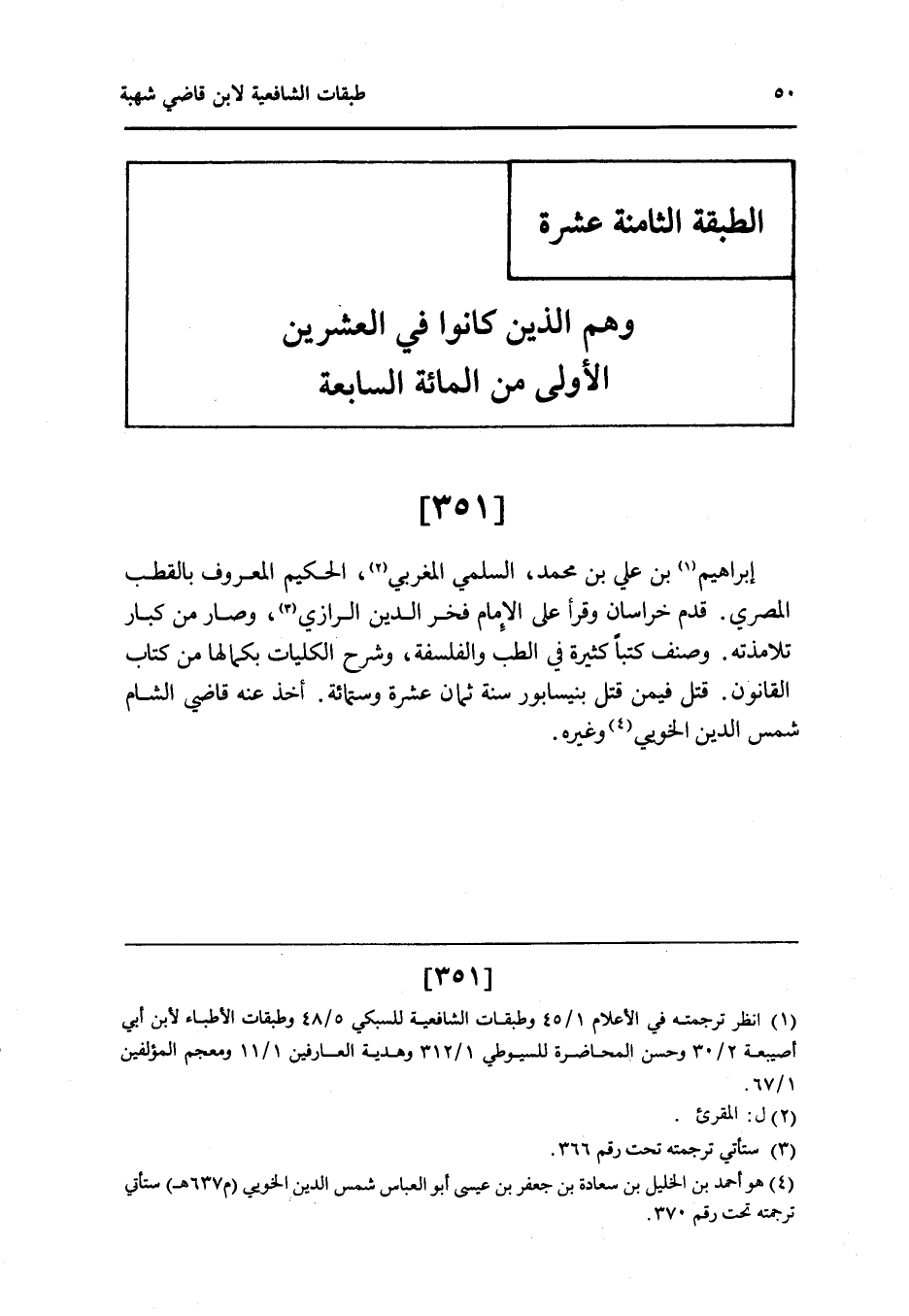 351 - إِبْرَاهِيم بن عَليّ بن مُحَمَّد السّلمِيّ المغربي الْحَكِيم الْمَعْرُوف بالقطب الْمصْرِيّ قدم خُرَاسَان وَقَرَأَ على الإِمَام فَخر الدَّين الرَّازِيّ وَصَارَ من كبار تلامذته وصنف كتبا كَثِيرَة فِي الطِّبّ والفلسفة وَشرح الكليات بكمالها من كتاب القانون قتل فِيمَن قتل بنيسابور سنة ثَمَان عشرَة وسِتمِائَة أَخذ عَنهُ قَاضِي الشَّام شمس الدَّين الخوبي وَغَيره