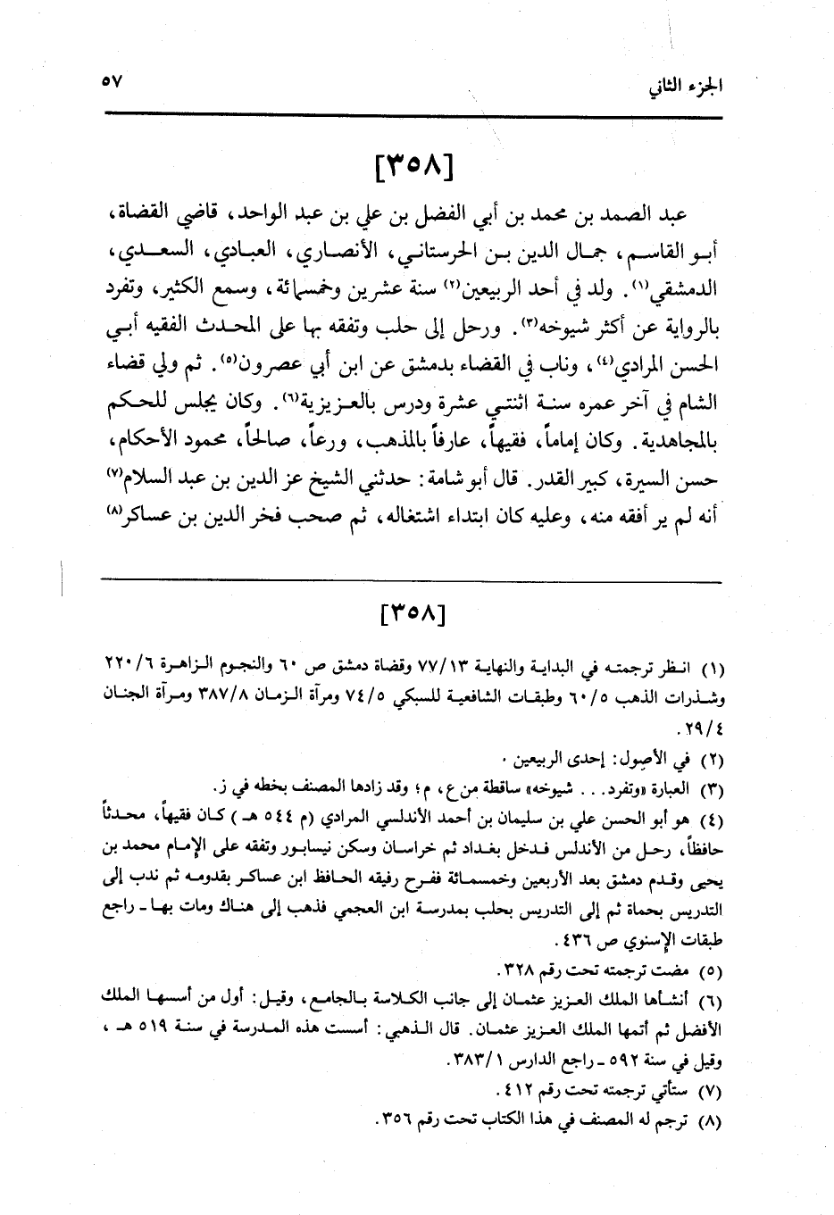 358 - عبد الصَّمد بن مُحَمَّد بن أبي الْفضل بن عَليّ بن عبد الْوَاحِد قَاضِي الْقُضَاة أَبُو الْقَاسِم جمال الدَّين بن الحرستاني الْأنْصَارِيّ الْعَبَّادِيّ السَّعْدِيّ الدِّمَشْقِي ولد فِي أحد الربيعين سنة عشْرين وَخَمْسمِائة وَسمع الْكثير وَتفرد بالرواية عَن أَكثر شُيُوخه ورحل إِلَى حلب وتفقه بهَا على الْمُحدث الْفَقِيه أبي الْحسن الْمرَادِي وناب فِي الْقَضَاء بِدِمَشْق عَن ابي عصرون ثمَّ ولي قَضَاء الشَّام فِي آخر عمره سنة اثْنَتَيْ عشرَة ودرس بالعزيزية وَكَانَ يجلس للْحكم بالمجاهدية وَكَانَ إِمَامًا فَقِيها عَارِفًا بِالْمذهبِ ورعا صَالحا مَحْمُود الْأَحْكَام حسن السِّيرَة كَبِير الْقدر قَالَ أَبُو شامة حَدثنِي الشَّيْخ عز الدَّين بن عبد السَّلَام أَنه لم ير أفقه مِنْهُ وَعَلِيهِ كَانَ ابْتِدَاء اشْتِغَاله ثمَّ صحب فَخر الدَّين بن عَسَاكِر