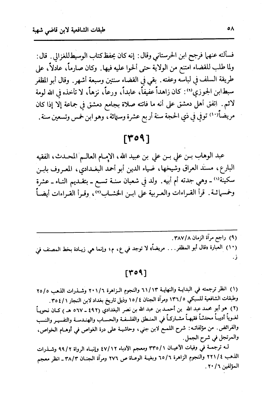 359 - عبد الْوَهَّاب بن عَليّ بن عَليّ بن عبيد الله الإِمَام الْعَالم الْمُحدث الْفَقِيه البارع مُسْند الْعرَاق وشيخها ضِيَاء الدَّين أَبُو أَحْمد الْبَغْدَادِيّ الْمَعْرُوف بِابْن سكينَة وَهِي جدته أم أَبِيه ولد فِي شعْبَان سنة تسع بِتَقْدِيم التَّاء عشرَة وَخَمْسمِائة قَرَأَ الْقرَاءَات والعربية على ابْن الخشاب وَقَرَأَ الْقرَاءَات أَيْضا
