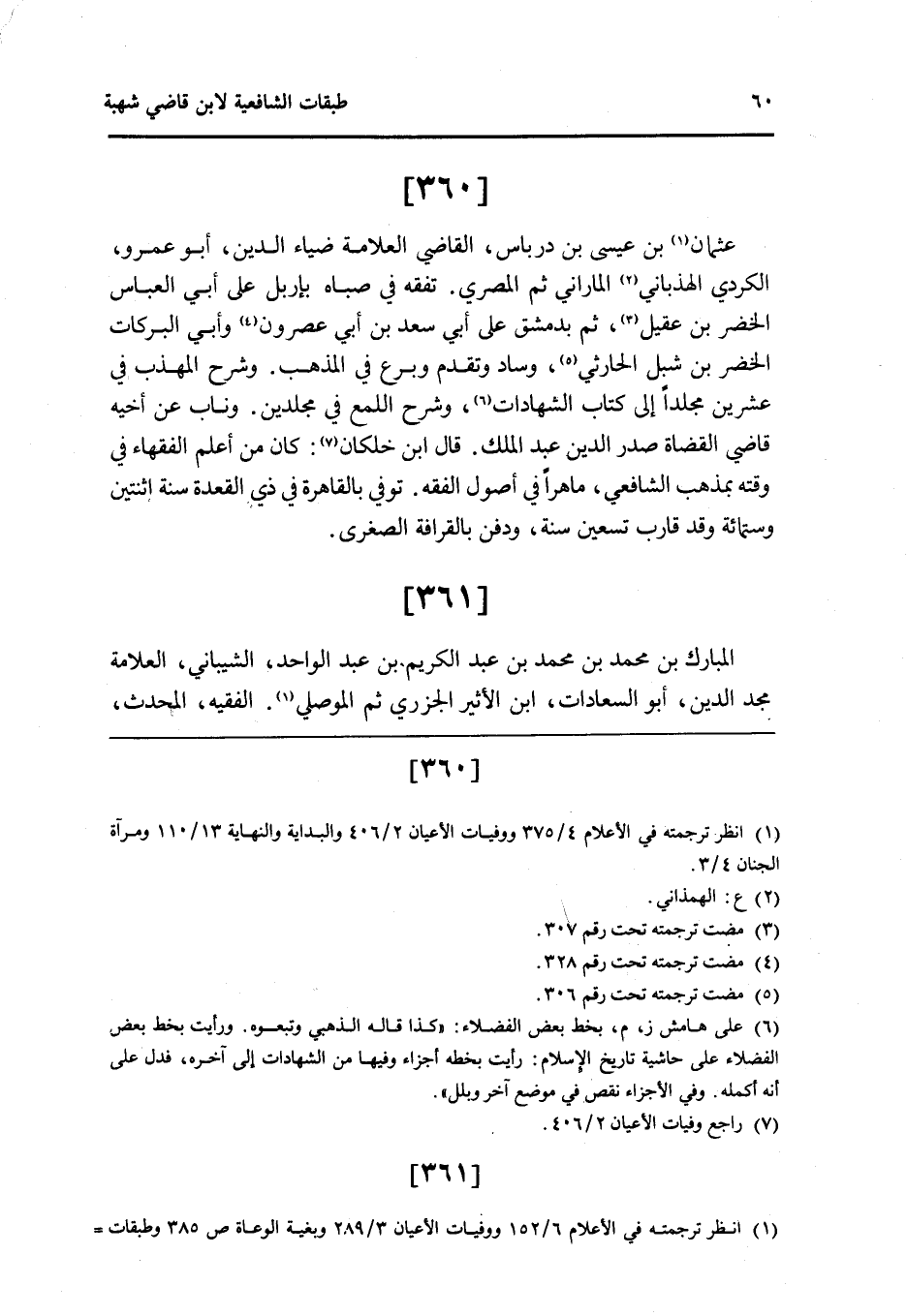 360 - عُثْمَان بن عِيسَى بن درباس القَاضِي الْعَلامَة ضِيَاء الدَّين أَبُو عَمْرو الْكرْدِي الهذباني الماراني ثمَّ الْمصْرِيّ تفقه فِي صباه بإربل على أبي الْعَبَّاس الْخضر بن عقيل ثمَّ بِدِمَشْق على أبي سعد بن أبي عصرون وَأبي البركات الْخضر بن شبْل الْحَارِثِيّ وساد وَتقدم وبرع فِي الْمَذْهَب وَشرح الْمُهَذّب فِي عشْرين مجلدا إِلَى كتاب الشَّهَادَات وَشرح اللمع فِي مجلدين وناب عَن أَخِيه قَاضِي الْقُضَاة صدر الدَّين عبد الْملك قَالَ ابْن خلكان كَانَ من أعلم الْفُقَهَاء فِي وقته بِمذهب الشَّافِعِي ماهرا فِي أصُول الْفِقْه توفّي بِالْقَاهِرَةِ فِي ذِي الْقعدَة سنة اثْنَتَيْنِ وسِتمِائَة وَقد قَارب تسعين سنة وَدفن بالقرافة الصُّغْرَى