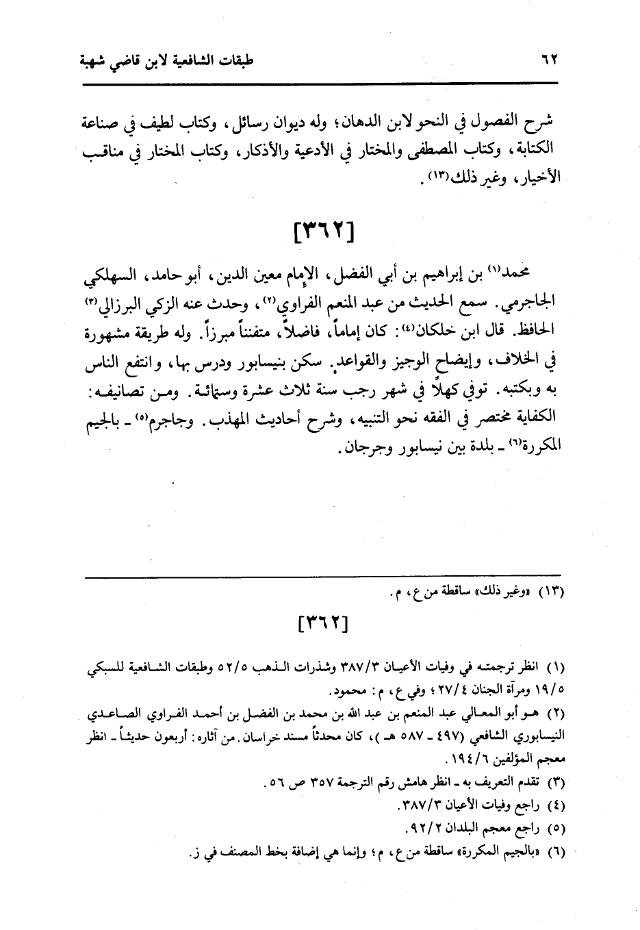 362 - مُحَمَّد بن أبراهيم بن أبي الْفضل الإِمَام معِين الدَّين أَبُو حَامِد السهلكي الجاجرمي سمع الحَدِيث من عبد الْمُنعم الفراوي وَحدث عَنهُ الزكي البرزالي الْحَافِظ قَالَ ابْن خلكان كَانَ إِمَامًا فَاضلا متفننا مبرزا وَله طَريقَة مَشْهُورَة فِي الْخلاف وإيضاح الْوَجِيز وَالْقَوَاعِد سكن بنيسابور ودرس بهَا وانتفع النَّاس بِهِ وبكتبه توفّي كهلا فِي شهر رَجَب سنة ثَلَاث عشرَة وسِتمِائَة وَمن تصانيفه الْكِفَايَة مُخْتَصر فِي الْفِقْه نَحْو التَّنْبِيه وَشرح أَحَادِيث الْمُهَذّب وجاجرم بِالْجِيم المكررة بَلْدَة بَين نيسابور وجرجان