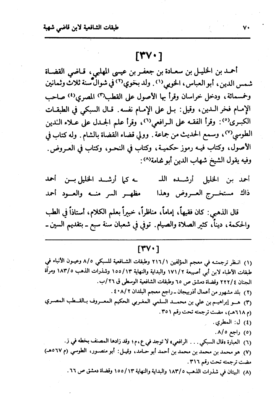 370 - أَحْمد بن الْخَلِيل بن سَعَادَة بن جَعْفَر بن عِيسَى المهلبي قَاضِي الْقُضَاة شمس الدَّين أَبُو الْعَبَّاس الخوبي ولد بخوي فِي شَوَّال سنة ثَلَاث وَثَمَانِينَ وَخَمْسمِائة وَدخل خُرَاسَان وَقَرَأَ بهَا الْأُصُول على القطب الْمصْرِيّ صَاحب الإِمَام فَخر الدَّين وَقيل بل على الإِمَام نَفسه قَالَ السُّبْكِيّ فِي الطَّبَقَات الْكُبْرَى وَقَرَأَ الْفِقْه على الرَّافِعِيّ وَقَرَأَ علم الجدل على عَلَاء الدَّين الطوسي وَسمع الحَدِيث من جمَاعَة وَولي قَضَاء الْقُضَاة بِالشَّام وَله كتاب فِي الْأُصُول وَكتاب فِيهِ رموز حكمِيَّة وَكتاب فِي النَّحْو وَكتاب فِي الْعرُوض وَفِيه يَقُول الشَّيْخ شهَاب الدَّين أَبُو شامة ... أَحْمد بن الْخَلِيل أرشده الله ... كَمَا أرشد الْخَلِيل بن أَحْمد ... ... ذَاك مستخرج الْعرُوض وَهَذَا ... مظهر السِّرّ مِنْهُ وَالْعود أَحْمد ...