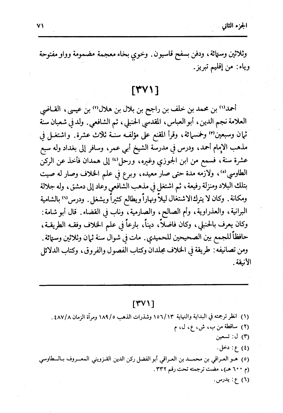 371 - أَحْمد بن مُحَمَّد بن خلف بن رَاجِح بن بِلَال بن هِلَال بن عِيسَى القَاضِي الْعَلامَة نجم الدَّين أَبُو الْعَبَّاس الْمَقْدِسِي الْحَنْبَلِيّ ثمَّ الشَّافِعِي ولد فِي شعْبَان سنة ثَمَان وَسبعين وَخَمْسمِائة وَقَرَأَ الْمقنع على مُؤَلفه سنة ثَلَاث عشرَة واشتغل فِي مَذْهَب الإِمَام أَحْمد ودرس فِي مدرسة الشَّيْخ أبي عمر وسافر إِلَى بَغْدَاد وَله سبع عشرَة سنة فَسمع من ابْن الْجَوْزِيّ وَغَيره ورحل إِلَى هَمدَان فَأخذ عَن الرُّكْن الطاوسي ولازمه مُدَّة حَتَّى صَار معيده وبرع فِي علم الْخلاف وَصَارَ لَهُ صيت بِتِلْكَ الْبِلَاد ومنزلة رفيعة ثمَّ اشْتغل فِي مَذْهَب الشَّافِعِي وَعَاد إِلَى دمشق وَله جلالة ومكانة وَكَانَ لَا يتْرك الِاشْتِغَال لَيْلًا وَنَهَارًا ويطالع كثيرا ويشغل ودرس بالشامية البرانية والعذراوية وَأم الصَّالح والصارمية وناب فِي الْقَضَاء قَالَ أَبُو شامة وَكَانَ يعرف بالحنبلي وَكَانَ فَاضلا دينا بارعا فِي علم الْخلاف وَفقه الطَّرِيقَة حَافِظًا للْجمع بَين الصَّحِيحَيْنِ للحميدي مَاتَ فِي شَوَّال سنة ثَمَان وَثَلَاثِينَ وسِتمِائَة وَمن تصانيفه طَريقَة فِي الْخلاف مجلدان وَكتاب الْفُصُول والفروق وَكتاب الدَّلَائِل الأنيقة