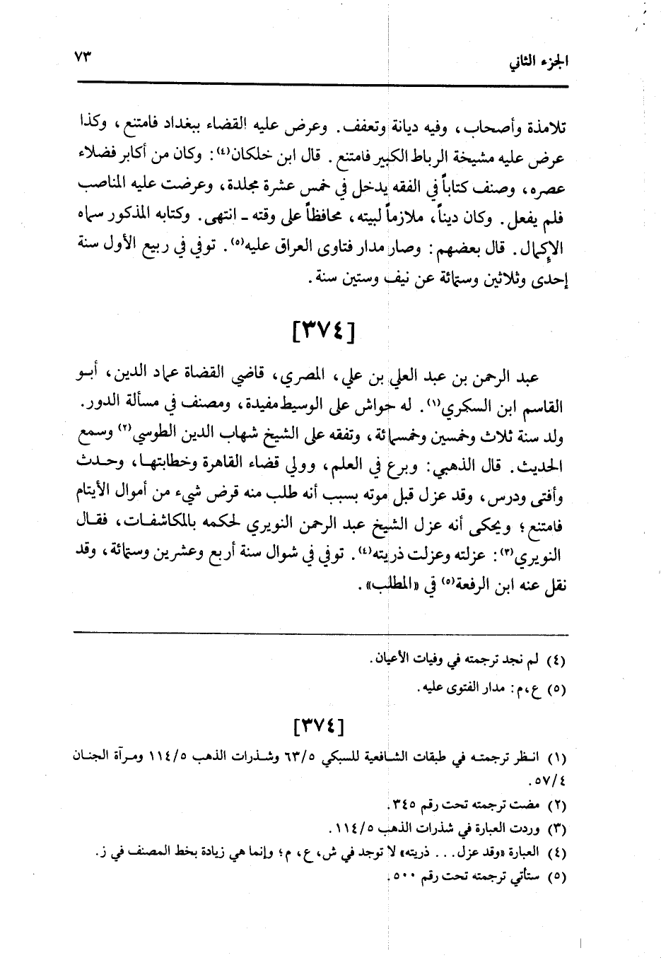 374 - عبد الرَّحْمَن بن عبد الْعلي بن عَليّ الْمصْرِيّ قَاضِي الْقُضَاة عماد الدَّين أَبُو الْقَاسِم ابْن السكرِي لَهُ حواش على الْوَسِيط مفيدة ومصنف فِي مَسْأَلَة الدّور ولد سنة ثَلَاث وَخمسين وَخَمْسمِائة وتفقه على الشَّيْخ شهَاب الدَّين الطوسي وَسمع الحَدِيث قَالَ الذَّهَبِيّ وبرع فِي الْعلم وَولي قَضَاء الْقَاهِرَة وخطابتها وَحدث وَأفْتى ودرس وَقد عزل قبل مَوته بِسَبَب أَنه طلب مِنْهُ قرض شَيْء من أَمْوَال الْأَيْتَام فَامْتنعَ ويحكى انه عزل الشَّيْخ عبد الرَّحْمَن النويري لحكمه بالمكاشفات فَقَالَ النويري عزلته وعزلت ذُريَّته توفّي فِي شَوَّال سنة أَربع وَعشْرين وسِتمِائَة وَقد نقل عَنهُ ابْن الرّفْعَة فِي الْمطلب