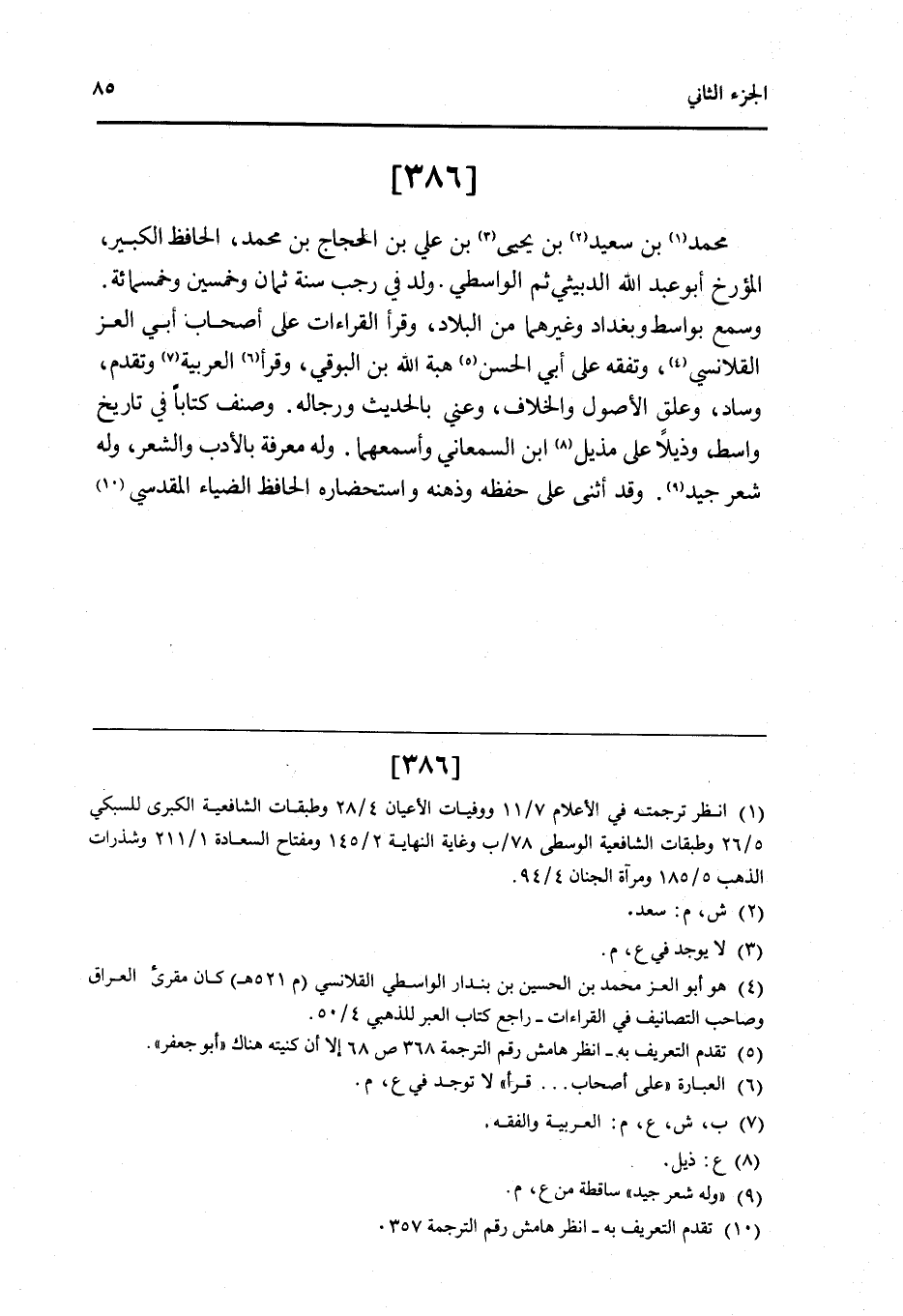 386 - مُحَمَّد بن سعيد بن يحيى بن عَليّ بن الْحجَّاج بن مُحَمَّد الْحَافِظ الْكَبِير المؤرخ أَبُو عبد الله الدبيثي ثمَّ الوَاسِطِيّ ولد فِي رَجَب سنة ثَمَان وَخمسين وَخَمْسمِائة وَسمع بواسط وبغداد وَغَيرهمَا من الْبِلَاد وَقَرَأَ الْقرَاءَات على أَصْحَاب أبي الْعِزّ القلانسي وتفقه على أبي الْحسن هبة الله بن البوقي وَقَرَأَ الْعَرَبيَّة وَتقدم وساد وعلق الْأُصُول وَالْخلاف وعني بِالْحَدِيثِ وَرِجَاله وصنف كتابا فِي تَارِيخ وَاسِط وذيلا على مذيل ابْن السَّمْعَانِيّ وأسمعهما وَله معرفَة بالأدب وَالشعر وَله شعر جيد وَقد أثنى على حفظه وذهنه واستحضاره الْحَافِظ الضياء الْمَقْدِسِي