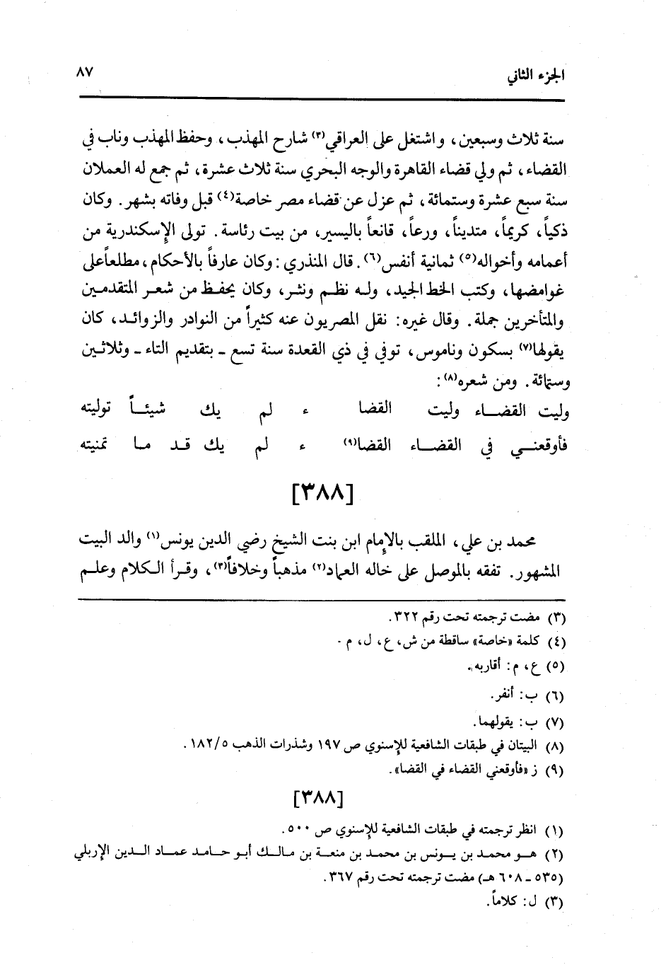 388 - مُحَمَّد بن عَليّ الملقب بِالْإِمَامِ ابْن بنت الشَّيْخ رَضِي الدَّين يُونُس وَالِد الْبَيْت الْمَشْهُور تفقه بالموصل على خَاله الْعِمَاد مذهبا وَخِلَافًا وَقَرَأَ الْكَلَام وَعلم