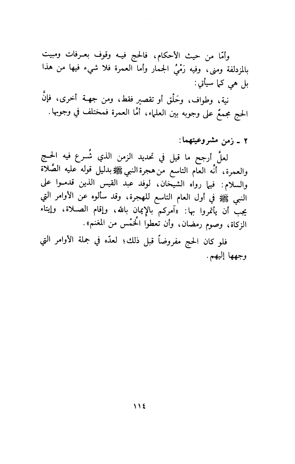 لعل أرجح ما قيل في تحديد الزمن الذي شرع فيه الحج والعمرة، أنه العام التاسع من هجرة النبي - صلى الله عليه وسلم - بدليل قوله عليه الصلاة والسلام: فيما رواه الشيخان، لوفد عبد القيس الذين قدموا على النبي - صلى الله عليه وسلم - في أول العام التاسع للهجرة، وقد سألوه عن الأوامر التي يجب أن يأتمروا بها: " آمركم بالإيمان بالله، وإقام الصلاة، وإيتاء الزكاة، وصوم رمضان، وأن تعطوا الخمس من المغنم ".