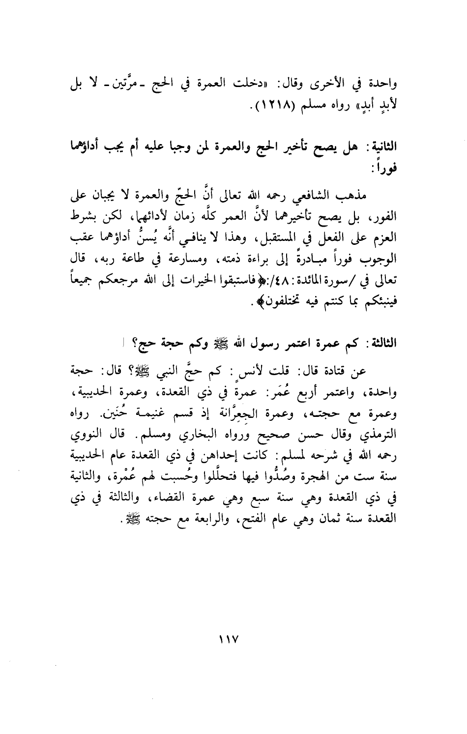 عن قتادة قال: قلت لأنس: كم حج النبي - صلى الله عليه وسلم - " قال حجة واحدة، واعتمر أربع عمرت في ذي القعدة، وعمرة الحديبية، وعمرة مع حجته، وعمرة الجعرانة إذ قسم غنيمة حنين. رواه الترمذي وقال حسن صحيح ورواه البخاري ومسلم. قال النووي رحمه الله في شرحه لمسلم: كانت إحداهن في ذي القعدة عام الحديبية سنة ست من الهجرة وصدوا فيها فتحللوا وحسبت لهم عمرة، والثانية في ذي القعدة وهي سنة سبع وهي عمرة القضاء، والثالثة في ذي القعدة سنة ثمان وهي عام الفتح، والرابعة مع حجته - صلى الله عليه وسلم -.