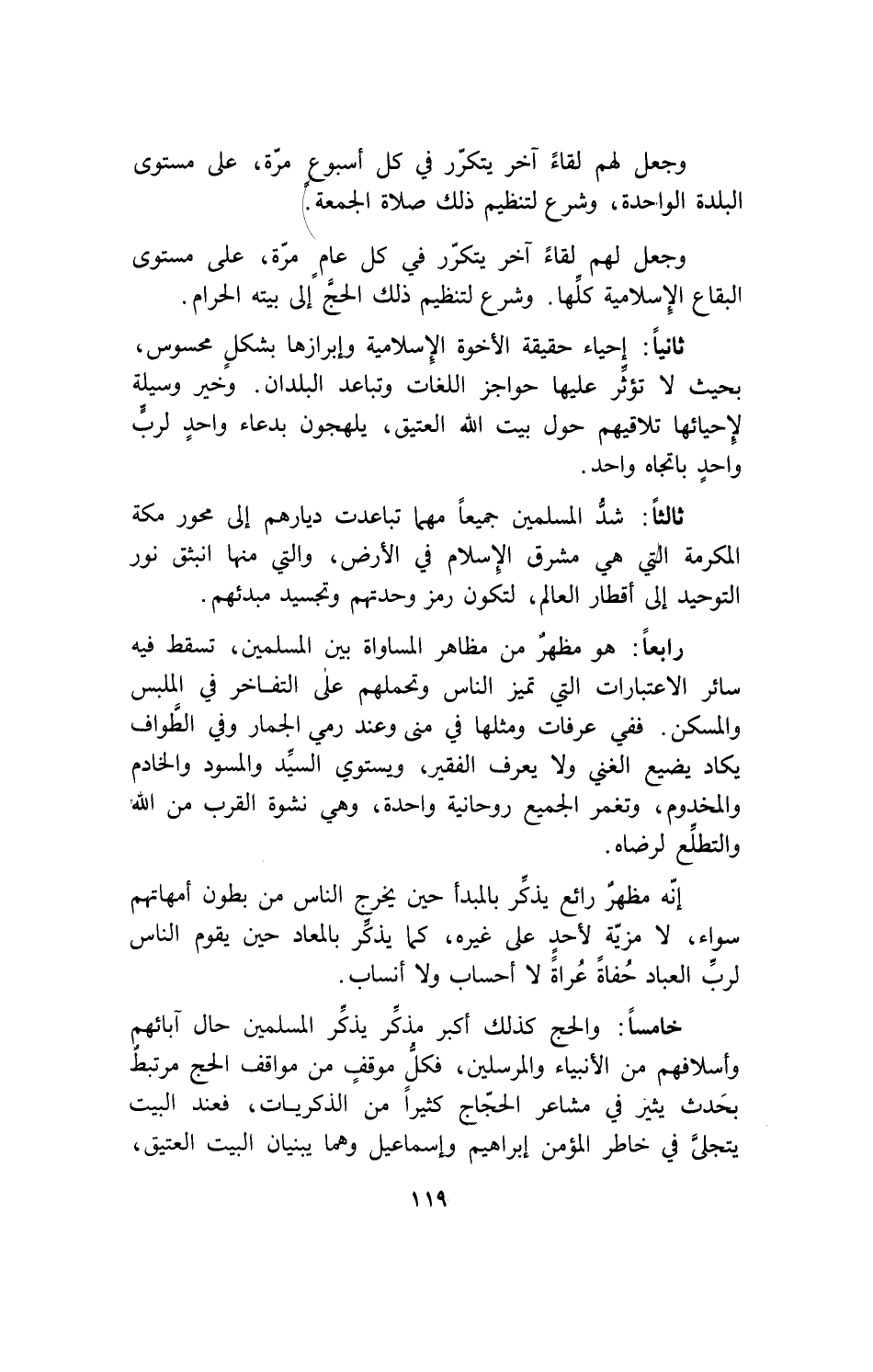 ثالثاً: شد المسلمين جميعاً مهما تباعدت ديارهم إلى محور مكة المكرمة التي هي مشرق الإسلام في الأرض، والتي منها انبثق نور التوحيد إلى أقطار العالم، لتكون رمز وحدتهم وتجسيد مبدئهم.