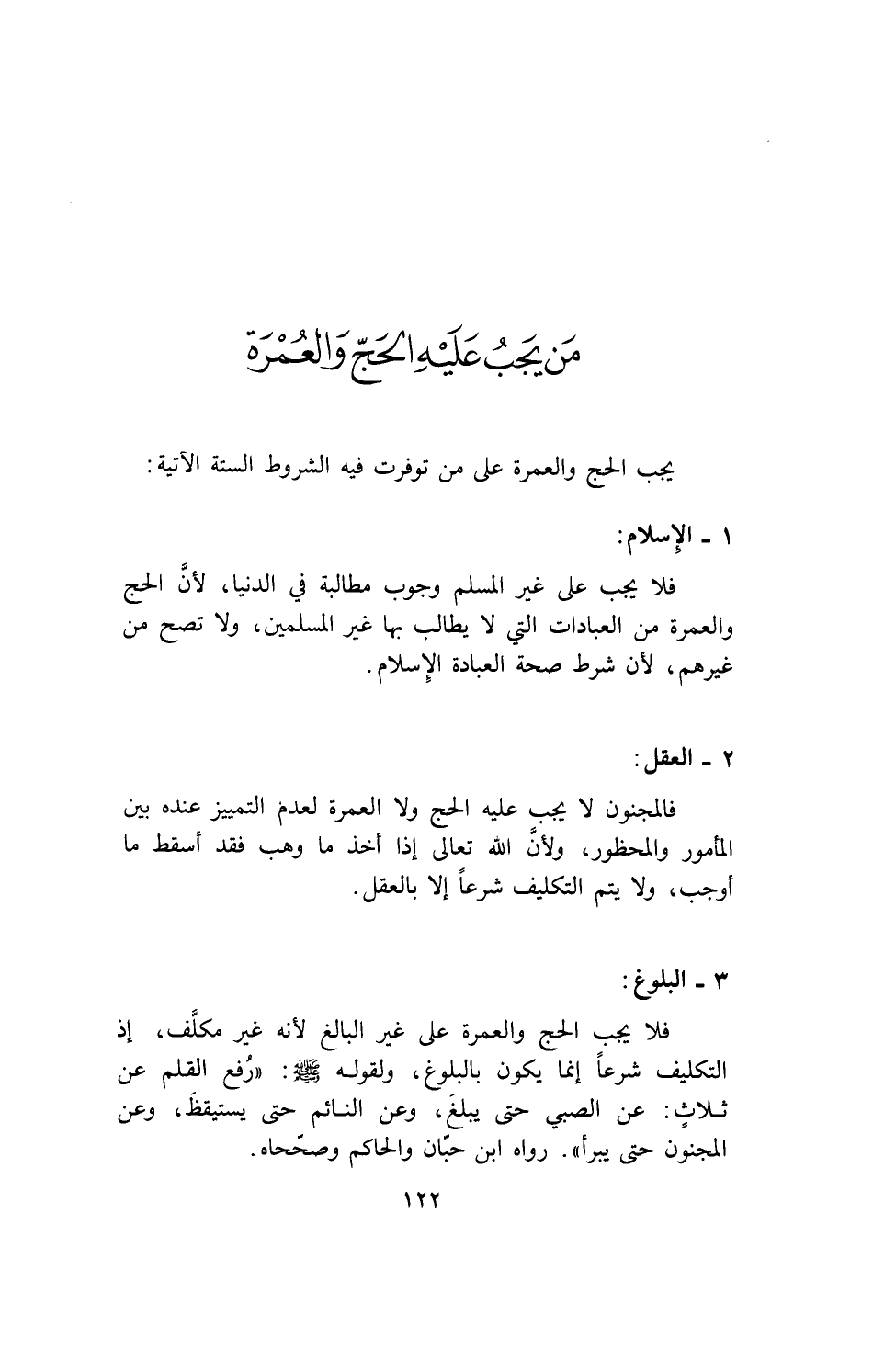 فلا يجب الحج والعمرة على غير البالغ لأنه غير مكلف، إذ التكليف شرعاً إنما يكون بالبلوغ، ولقوله - صلى الله عليه وسلم -: " رفع القلم عن ثلاث: عن الصبي حتى يبلغ، وعن النائم حتى يستيقظ، وعن المجنون حتى يبرأ ". رواه ابن حبان والحاكم وصححاه.