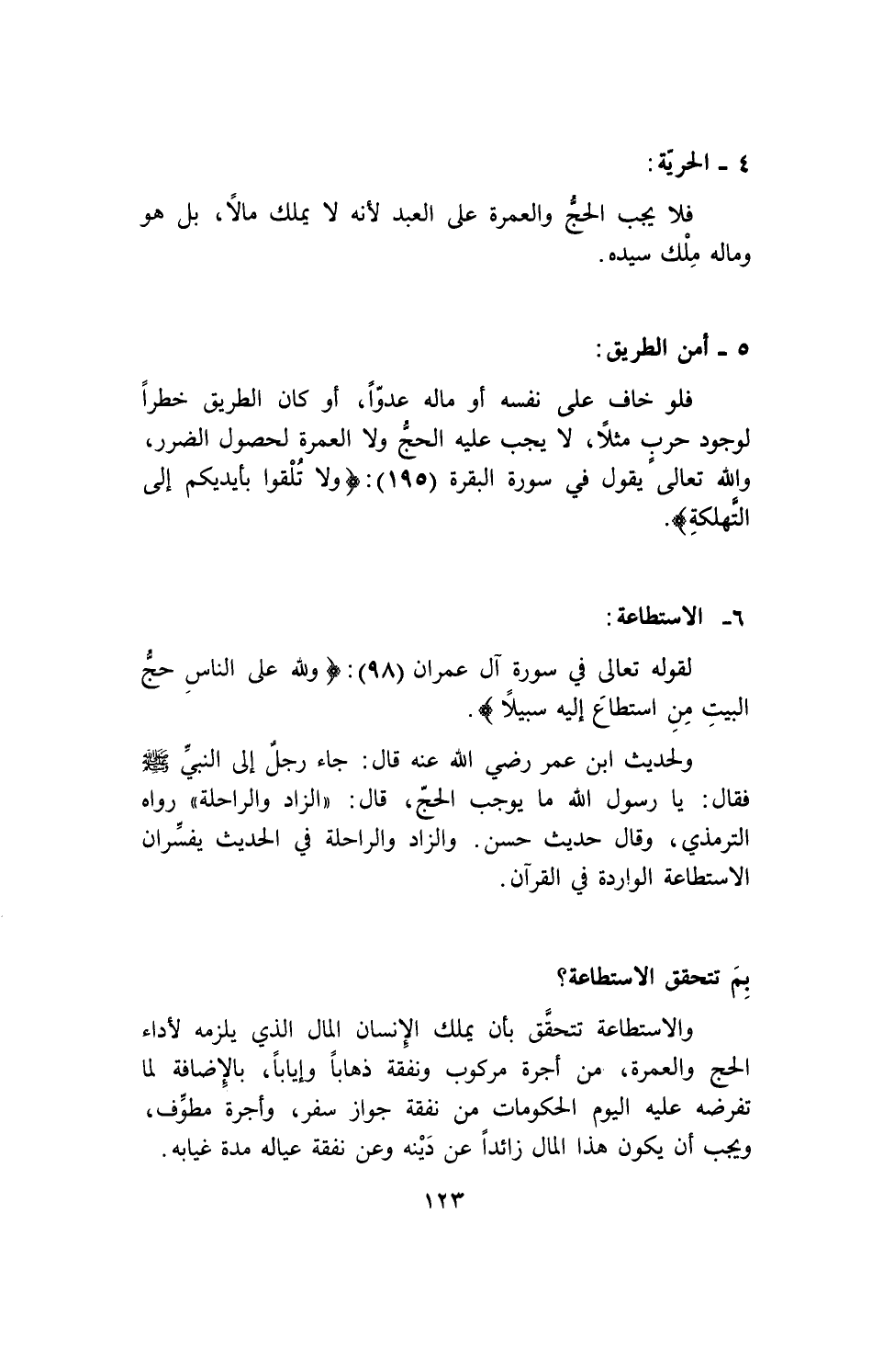 ولحديث ابن عمر - رضي الله عنه - قال: جاء رجل إلى النبي - صلى الله عليه وسلم - فقال: يا رسول الله ما يوجب الحج، قال: "الزاد والراحلة " رواه الترمذي، وقال حديث حسن. والزاد والراحلة في الحديث يفسران الاستطاعة الواردة في القرآن.