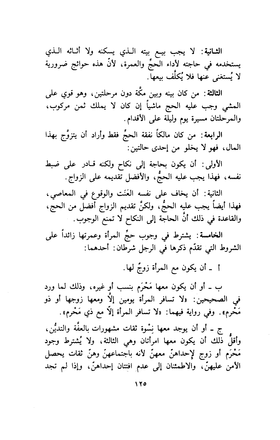 الخامسة: يشترط في وجوب حج المرأة وعمرتها زائداً على الشروط التي تقدم ذكرها في الرجل شرطان: أحدهما: