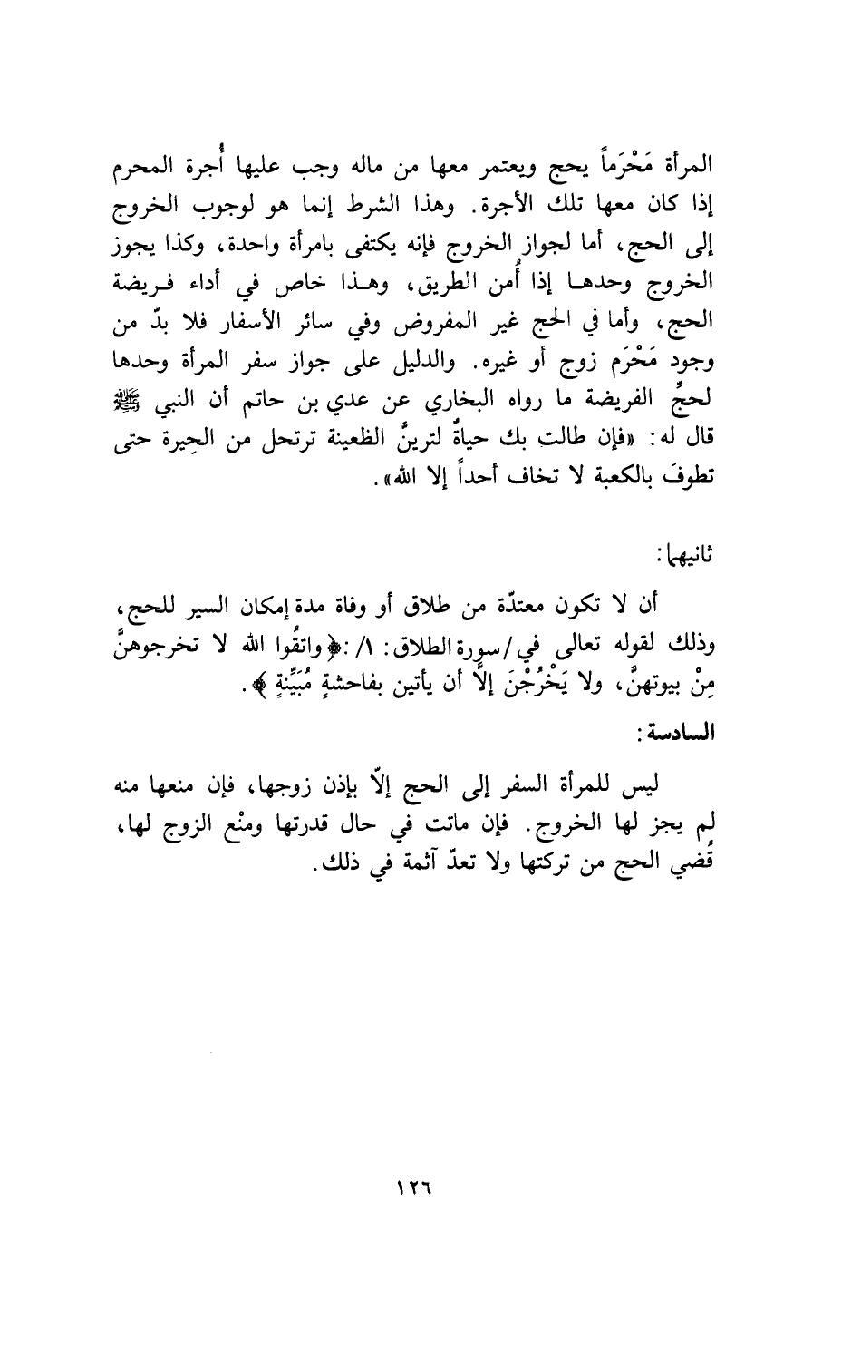 أن لا تكون معتدة من طلاق أو وفاة مدة إمكان السير للحج، وذلك لقوله تعالى في / سورة الطلاق: 1/: {وَاتَّقُوا اللَّهَ رَبَّكُمْ لَا تُخْرِجُوهُنَّ مِن بُيُوتِهِنَّ وَلَا يَخْرُجْنَ إِلَّا أَن يَأْتِينَ بِفَاحِشَةٍ مُّبَيِّنَةٍ}