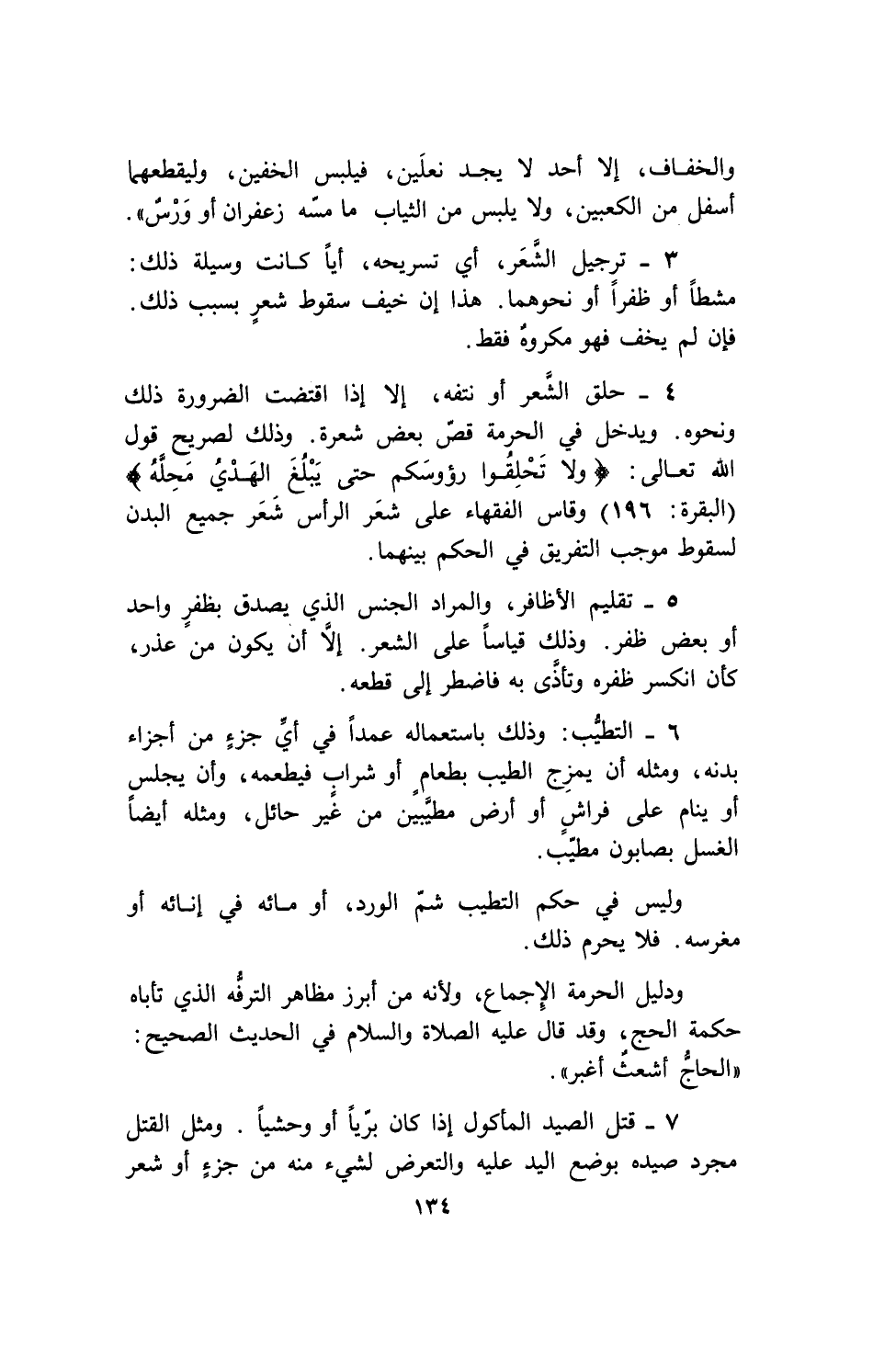 4ـ حلق الشعر أو نتفه، إلا إذا اقتضت الضرورة ذلك ونحوه. ويدخل في الحرمة قص بعض شعرة وذلك لصريح قول الله تعالى: {َلاَ تَحْلِقُواْ رُؤُوسَكُمْ حَتَّى يَبْلُغَ الْهَدْيُ مَحِلَّهُ} (البقرة: 196) وقاس الفقهاء على شعر الرأس شعر جميع البدن لسقوط موجب التفريق في الحكم بينهما.