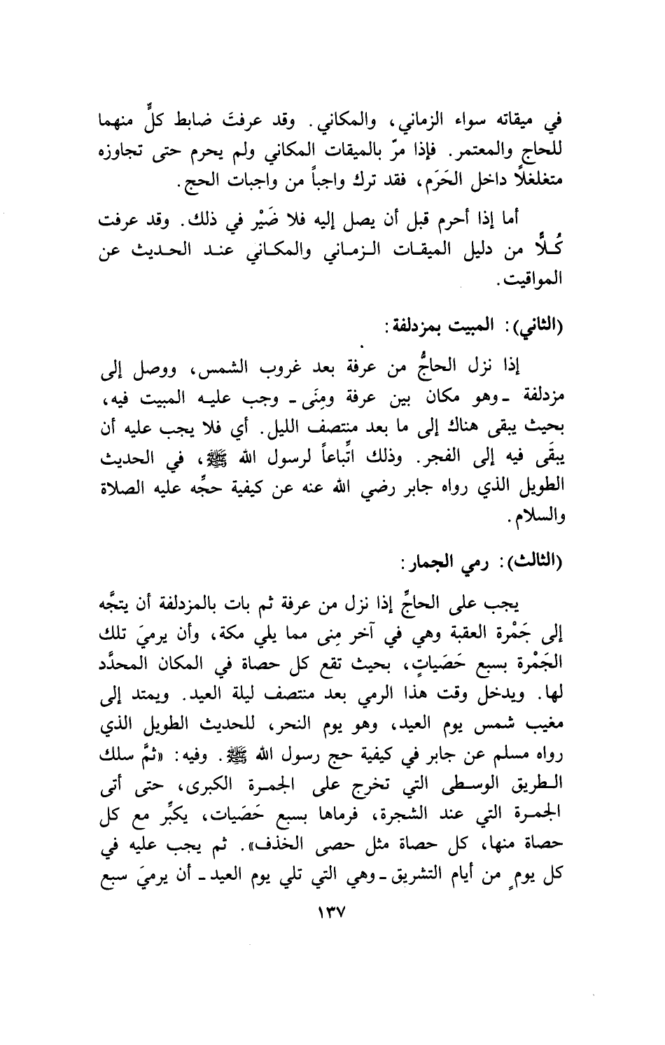 يجب على الحاج إذا نزل من عرفة ثم بات بالمزدلفة أن يتجه إلى جمرة العقبة وهي في آخر منى مما يلي مكة، وأن يرمي تلك الجمرة بسبع حصيات، بحيث تقع كل حصاة في المكان المحدد لها. ويدخل وقت هذا الرمي بعد منتصف ليلة العيد. ويمتد إلى مغيب شمس يوم العيد، وهو يوم النحر، للحديث الطويل الذي رواه مسلم عن جابر في كيفية حج رسول الله - صلى الله عليه وسلم - وفيه: " ثم سلك الطريق الوسطى التي تخرج على الجمرة الكبرى، حتى أتى حصاة منها، كل حصاة مثل حصى الخذف " ثم يجب عليه في كل يوم من أيام التشريق ـ وهي التي تلي يوم العيد ـ أن يرمى سبع