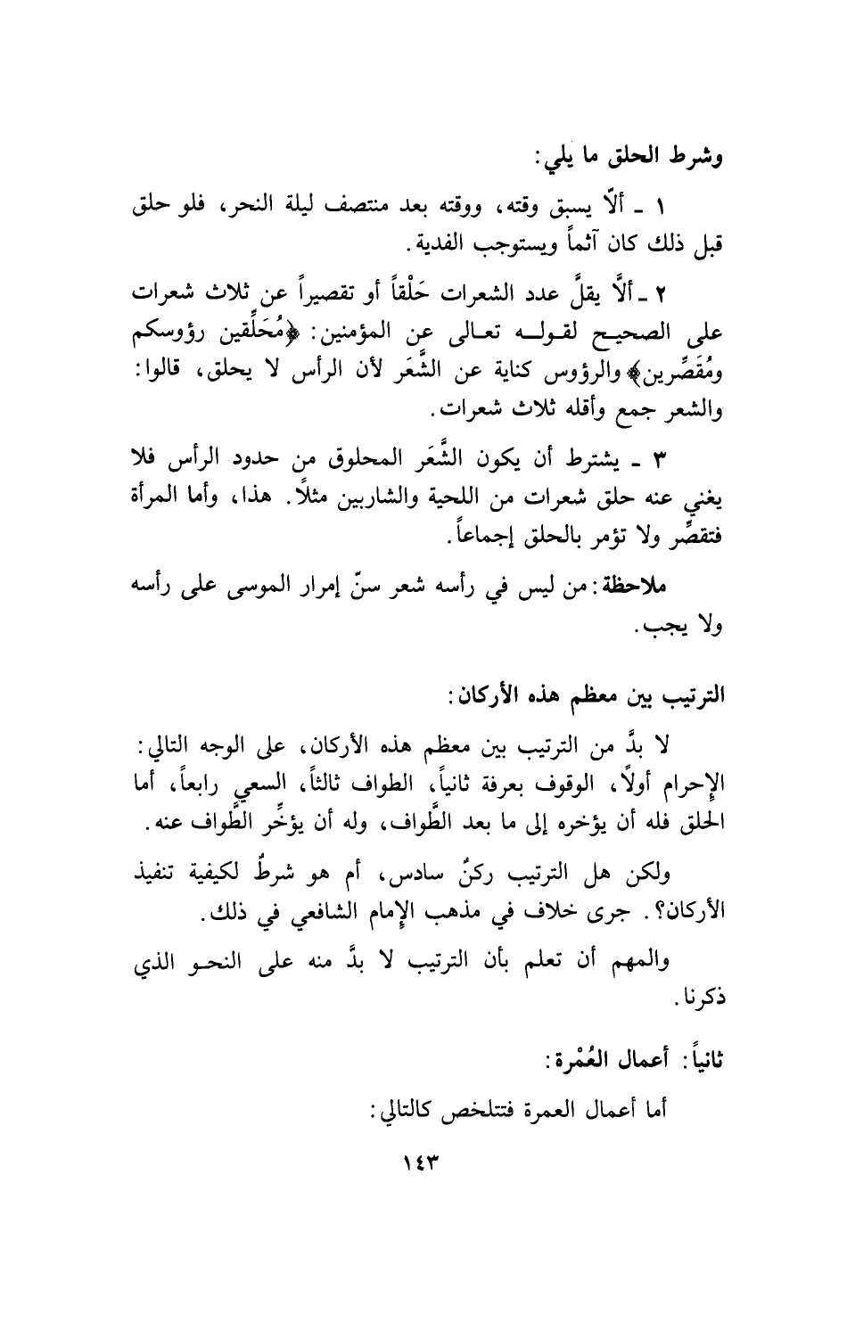 ملاحظة: من ليس في رأسه شعر سن إمرار الموسى على رأسه ولا يجب.