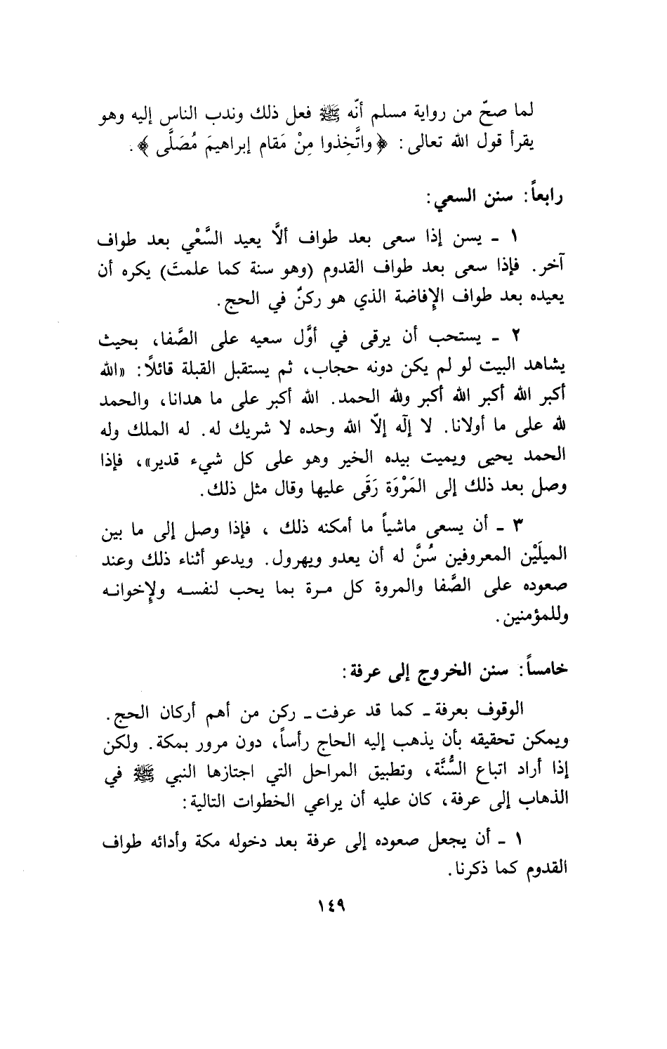 3ـ أن يسعى ماشياً ما أمكنه ذلك، فإذا وصل إلى ما بين الميلين المعروفين سن له أن يعدو ويهرول. ويدعوا أثناء ذلك وعند صعوده على الصفا والمروة كل مرة بما يجب لنفسه ولإخوانه وللمؤمنين.