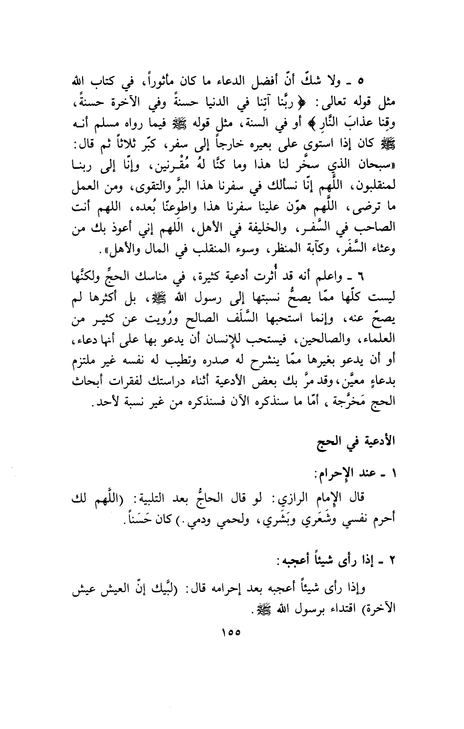 6ـ واعلم أنه قد أثرت أدعية كثيرة، في مناسك الحج ولكنها ليست كلها مما يصح نسبتها إلى رسول الله - صلى الله عليه وسلم -، بل أكثرها لم يصح عنه، وإنما استحبها السلف الصالح ورويت عن كثير من العلماء، والصالحين، فيستحب للإنسان أن يدعو بها على أنها دعاء، أو أن يدعوا بغيرها مما ينشرح له صدره وتطيب له نفسه غير ملتزم بدعاءٍ معين، وقد مر بك بعض الأدعية أثناء دراستك لفقرات أبحاث الحج مخرجة، أما ما سنذكره الآن فسنذكره من غير نسبة لأحد.